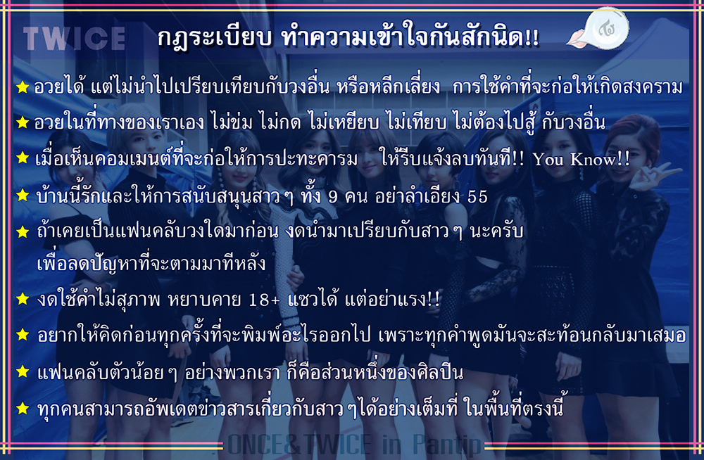 สวัสดีชาวเฉลิมกรุง และวันซ์ทุกท่านครับ เนื่องจากการคัมแบ็ค TWICE MINI ALBUM ที่ 4 นั้นมีแนวโน้มว่าจะมีการตั้งกระทู้ในบอร์ดกลางเป็นจำนวนมาก มีวันซ์หน้าใหม่ที่อาจจะยังไม่รู้ว่าทไวซ์มีคลับ เราจึงขอใช้โอกาสนี้ก่อนการคัมแบคตั้งกระทู้แนะนำคลับ เพื่อป้องกันกระทู้ถาม-ตอบ จำนวนมาก ซึ่งจะทำให้บอร์ดกลางรกและอาจทำให้ท่านอื่นที่ไม่ใช่แฟนคลับของสาวๆ เราเกิดความไม่พอใจขึ้นได้