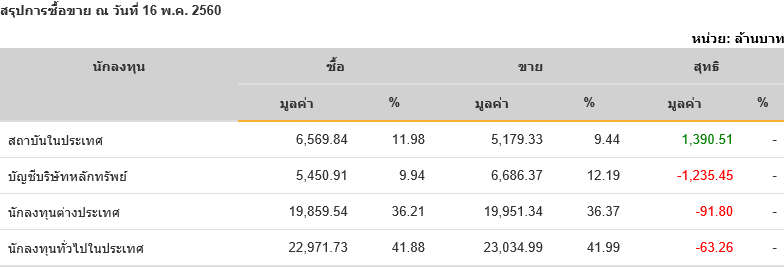 Sinthorn Summary 16/5/2560 : ต่างชาติขายสุทธิ -91.80 ลบ.