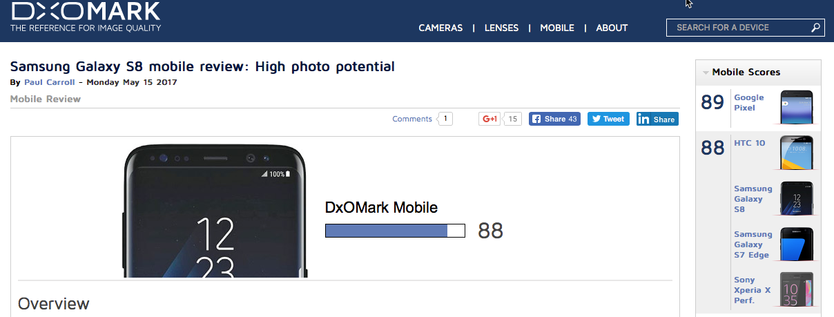 ล่าสุด ได้ออกผลการทดสอบกล้องของ Samsung Galaxy 8 ออกมา ผลคือ คะแนน เท่าเดิม กับ S7 ไม่มีอะไรเปลี่ยนแปลงตามนั้นแหละเจ้าค่ะ
