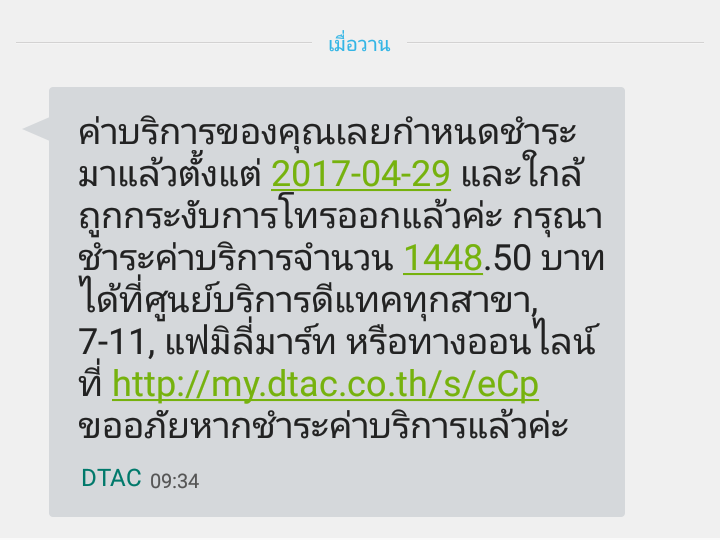 ได้รับ sms ตามภาพครับ ตอนนี้ผมไม่สบายแอดมิดอยู่ รพ. จะรบกวนขอชำระเป็นวันที่ 24/05/60 ครับ รบกวนประสานงานด้วยครับ 0915399xxx รหัส 7473