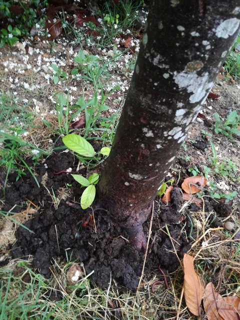 ต้นพยอมที่บ้าน มีใบขึ้นที่โคนต้น รู้สึกสงสัยจริงๆคะทำไมมันขึ้นตรงนี้