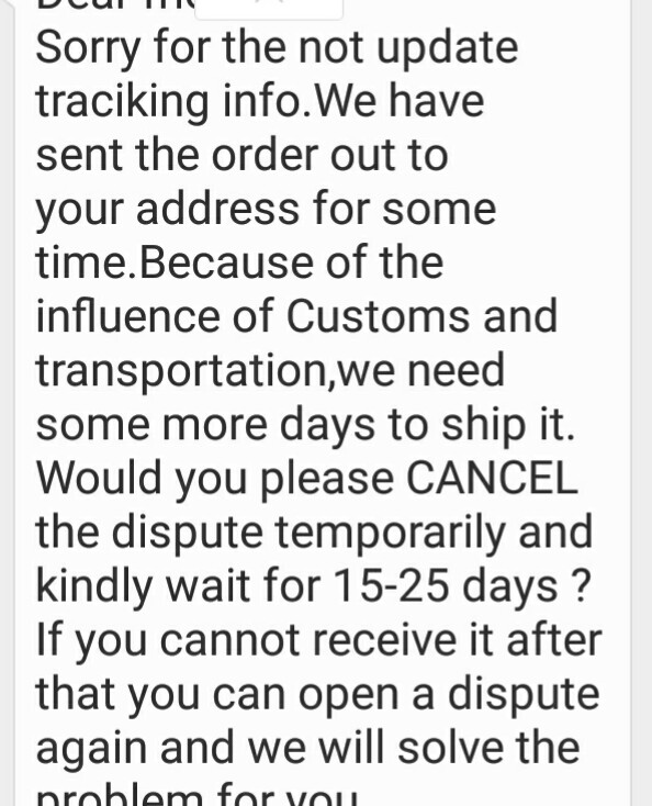 คือผมสังของมาตั้งแต่เดือน 3 วันที่21จนถึงเมื่อวานสองเดือนของยังไม่ได้tracking ก็ขึ้น in transit อยู่จีนมาสองเดือนมเหลือเวลาอีกแค่วันเดียวคนขายดันมาต่อเวลาผมเลยเปิด dispute ไปแต่ Sellerเลยส่งข้อความมาตามในรูป