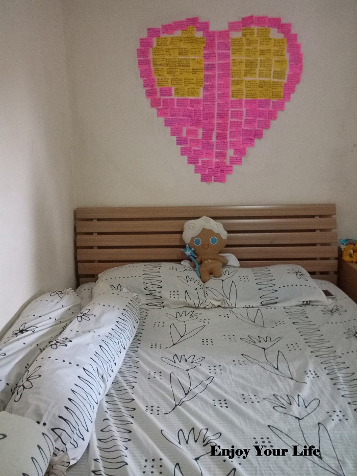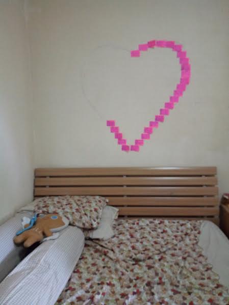 ส่วนที่ 3 หัวเตียงห้องนอนที่ดูจะโล่งว่าง ก็ตกแต่งด้วยดาษ Post-it ที่บรรจงเขียนข้อความดีๆ ที่เป็นกำลังใจในการทำงาน ความรัก และแรงบันดาลใจในการใช้ชีวิต ของความคิดด้านบวกลงไปตามรูปแบบภาพหัวใจที่ใช้ดินสอ 2B ร่างที่ผนังไว้ก่อน หลังติดเสร็จถ้ามีรอยดินสอ โผล่ออกมาก็ใช้ผ้า ไมโครเช็ดผนังให้ออกได้ พอดีว่า Post-it สีชมพูหมด แง้ววว.....แต่ยังมี สีส้มออกเหลืองอยู่ก็เลย แทรกไปให้ครบรูปหัวใจ ห้องก็เลยดูมีสีสันขึ้นมา ^_^