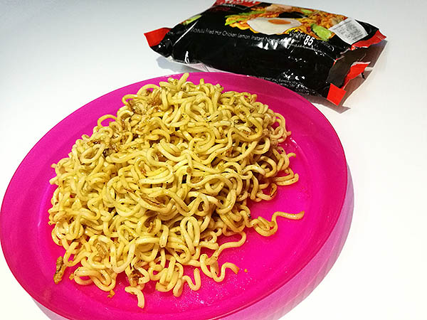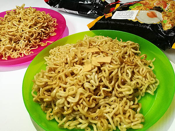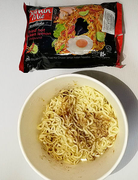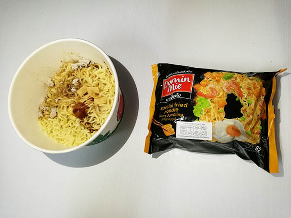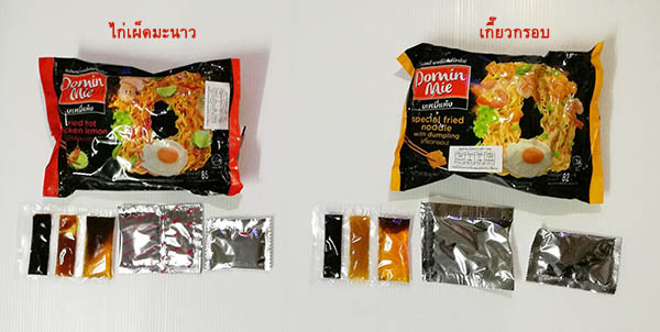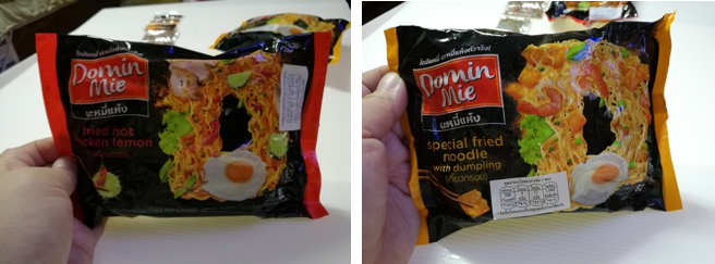 ไม่เคยเห็นที่ไหน เลยสอยมาอย่างละซองเพื่อเทสต์รสชาติกัน ยี่ห้อที่ว่าชื่อ Domin Mie บะหมี่แห้ง