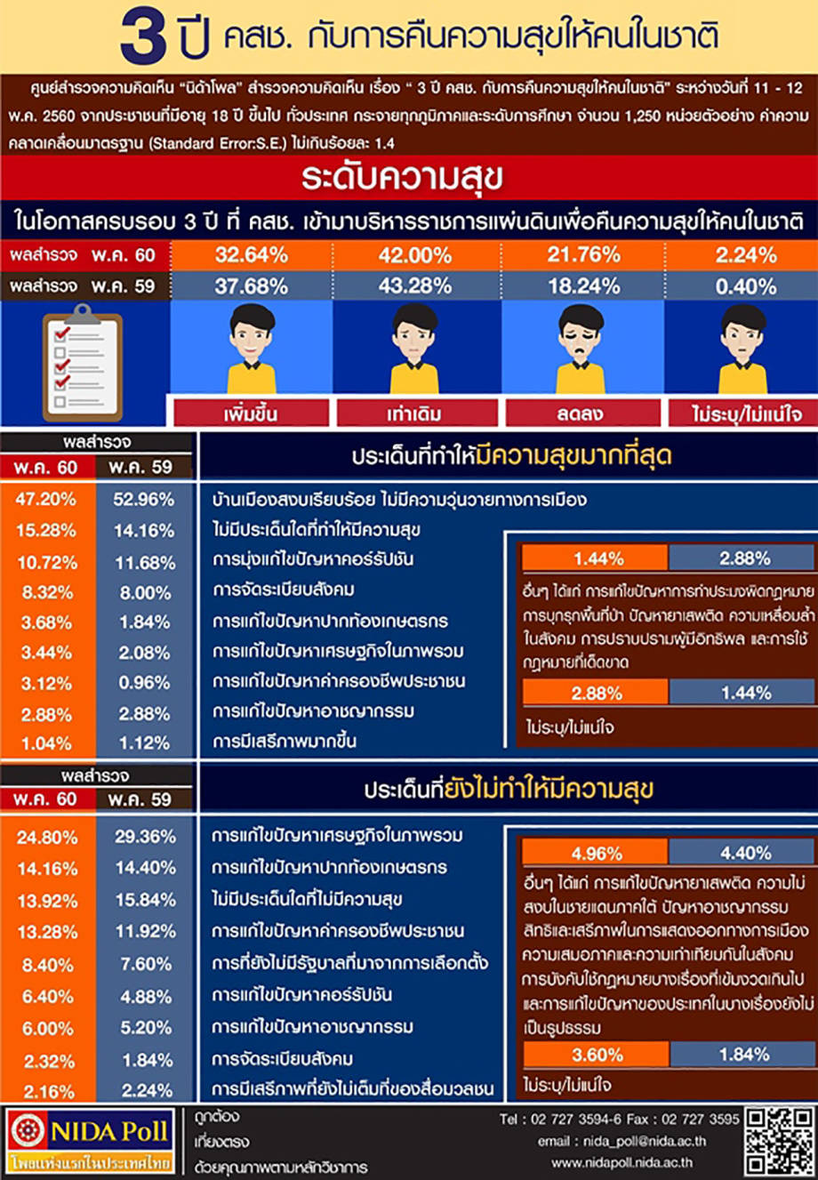 เมื่อวันที่ 21 พ.ค. ศูนย์สำรวจความคิดเห็น “นิด้าโพล” สถาบันบัณฑิตพัฒนบริหารศาสตร์ (นิด้า) เปิดเผยผลสำรวจความคิดเห็นของประชาชน เรื่อง “3 ปี คสช. กับการคืนความสุขให้คนในชาติ” จากประชาชนที่มีอายุ 18 ปีขึ้นไป ทั่วประเทศ กระจายทั่วทุกภูมิภาคและระดับการศึกษา รวมทั้งสิ้น จำนวน 1,250 หน่วยตัวอย่าง โดยเมื่อถามถึงระดับความสุขของประชาชนในโอกาสครบรอบ 3 ปี ของ คสช. ในการบริหารราชการแผ่นดินเพื่อคืนความสุขให้คนในชาติ พบว่าประชาชนส่วนใหญ่ ร้อยละ 42.00 ระบุว่า มีความสุขเท่าเดิม เพราะยังไม่มีอะไรเปลี่ยนแปลง ชีวิตความเป็นอยู่ยังคงเหมือนเดิม การบริหารงานไม่ได้เปลี่ยนไปจากเดิม เศรษฐกิจและค่าครองชีพยังสูงเช่นเดิม