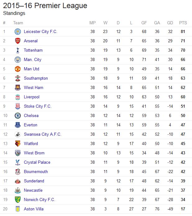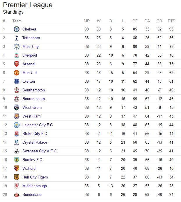 มูรินโญ่พาทีมเก็บชัยชนะได้น้อยกว่าจอมปรัชญา LVG 1 นัด และเก็บคะแนนได้มากกว่าแค่ 3 คะแนน อันดับต่ำกว่า 1 อันดับ แต่อย่างไรก็ตามครับ อย่างที่เห็นในตาราง มาตรฐานการเก็บแต้มในฤดูกาลนี้โหดกันขึ้นมาเยอะเมื่อเทียบกับฤดูกาลก่อน เลสเตอร์ เคยคว้าแชมป์ได้ด้วยแต้มเพียง 81 คะแนน ซึ่งนั่นไม่พอแม้แต่จะเป็นรองแชมป์ในปีนี้ที่ทีมเชลซีเก็บไป 93 คะแนน และไก่กุ๊กๆ เก็บไป 86 คะแนน รองแชมป์ปีที่แล้วอย่าง อาเซน่อล ทำแต้มได้มากกว่าเดิม 4 คะแนน แต่ยังตกมาเป็นอับดับ 5 (ขอบคุณคุณ Infernal ที่ทักฮะ)