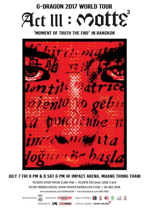 จี-ดรากอน หัวหน้าวงบิ๊กแบง (BIGBANG) ศิลปินบอยแบนด์ที่ฮอตที่สุดในประเทศเกาหลี ประกาศจัดเวิลด์ทัวร์ครั้งที่ 2 ของเขาในฐานะศิลปินเดี่ยว โดยใช้ชื่อทัวร์ว่า “จี-ดรากอน 2017 เวิลด์ ทัวร์ <แอคท์ 3, ม็อทเท>” (G-DRAGON 2017 WORLD TOUR <ACT III, M.O.T.T.E>)