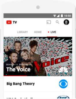 บนแอปพลิเคชั่น YouTube คุณสามารถรับชมการสตรีมรายการ TV ร่วมกับครอบครัวของคุณได้จาก ABC, FOX, NBC, CBS และเครือข่ายเคเบิลอื่นๆ และยังนำเสนอเครื่องบันทึกแบบคลาวด์ (Cloud DVR) ซึ่งไม่ต้องใช้พื้นที่สำหรับเก็บข้อมูล ในราคา 35 เหรียญฯ ต่อเดือน สำหรับตอนนี้ YouTube TV สามารถใช้บริการได้เฉพาะบางพื้นที่เท่านั้น เช่น ซานฟรานซิสโกเบย์แอเรีย, นิวยอร์ก และชิคาโก