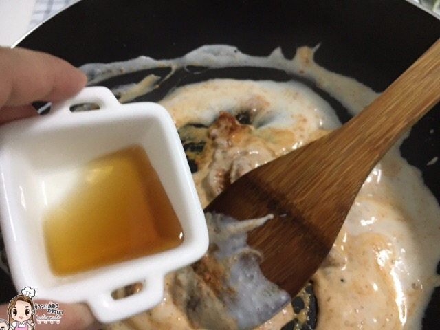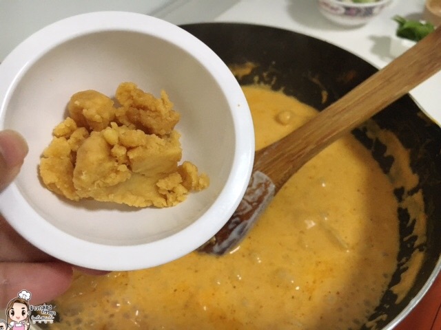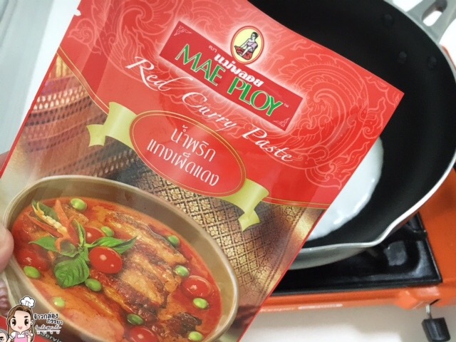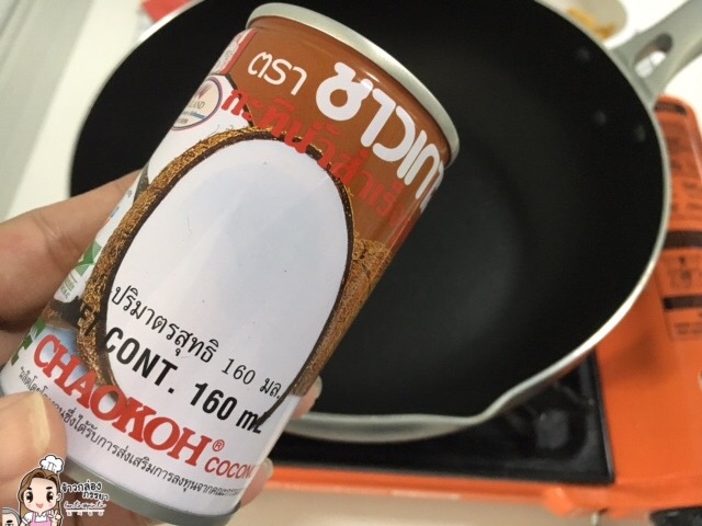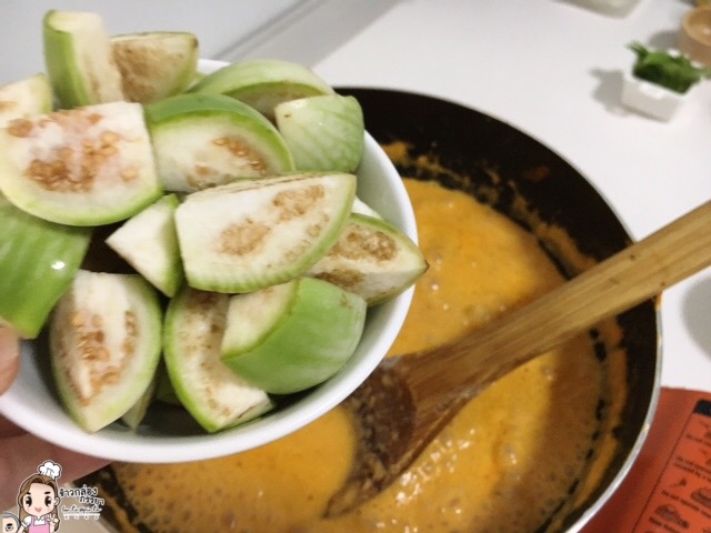 1 นำพริกแกงลงไปผัดกับหัวกะทิให้หอม เติมน้ำปลาลงไปตอนนี้ได้นะคะ จะเพิ่มความหอมให้กับพริกแกง