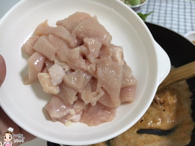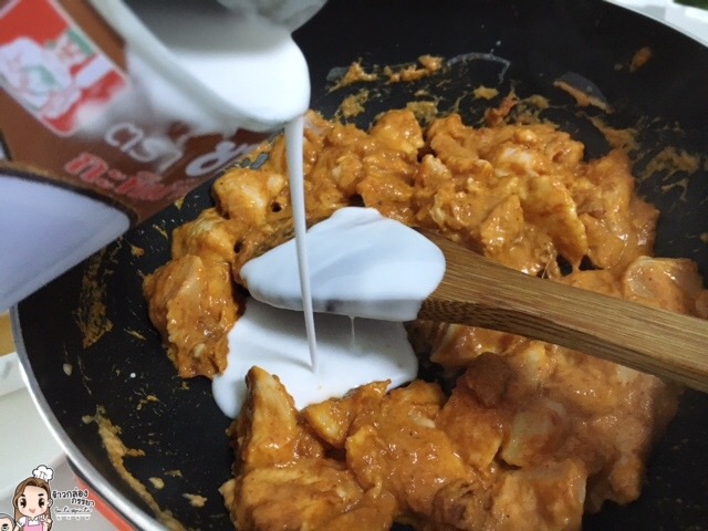 2 ใส่เนื้อไก่ลงไปผัดให้พอสุก จากนั้นเติมกะทิที่เหลือลงไป ถ้าข้นไปเติมน้ำเปล่าได้นะคะ