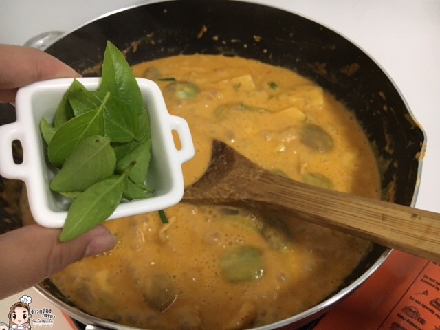 4 โรยใบโหระพา แล้วปิดไฟ เสร็จแล้วจัดจานให้สวยงามค่าาา ทานคู่กับขนมจีน