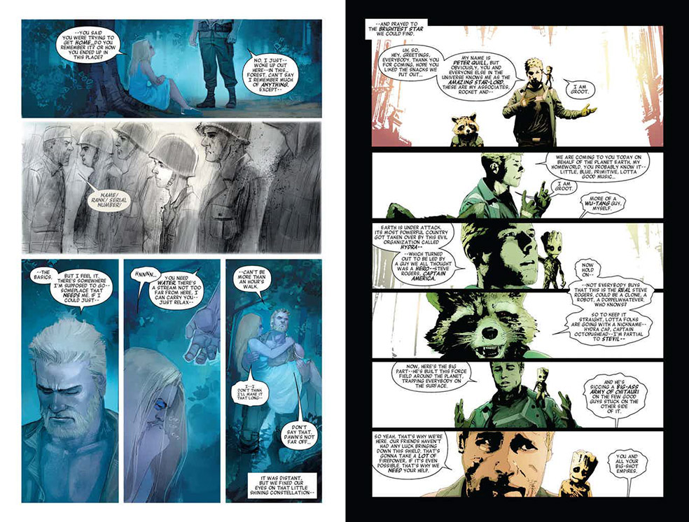 ผู้อ้างตนว่าชื่อสตีฟแบกผู้หญิงที่บาดเจ็บไปที่แหล่งน้ำกลางป่า ส่วนควิลล์กับร็อคเก็ตและกรู๊ทไปขอความช่วยเหลือจากเอเลี่ยนซักพวกให้มาพังบาเรีย