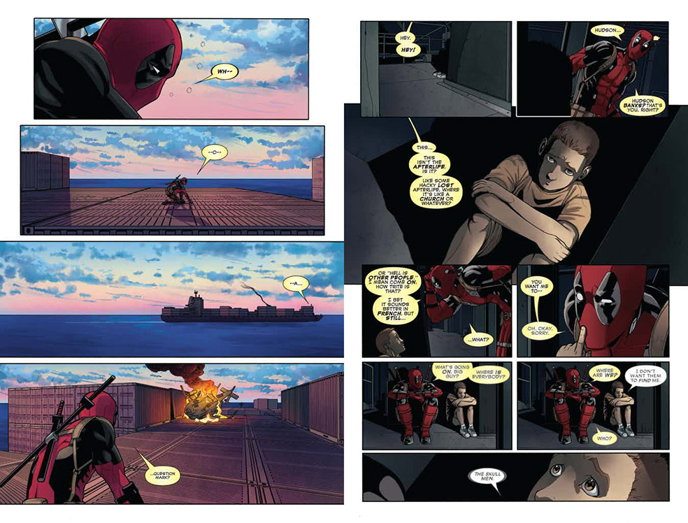 เดดพูลฟื้นขึ้นมาในเรือลำหนึ่ง เดินสำรวจรอบ ๆ ก็ไม่เจอใครนอกจากลูกของแบงค์ที่กำลังซ่อนตัวจากแทสก์มาสเตอร์อยู่ (หรือพันนิชเชอร์หว่า เป็นไปได้ทั้งคู่)