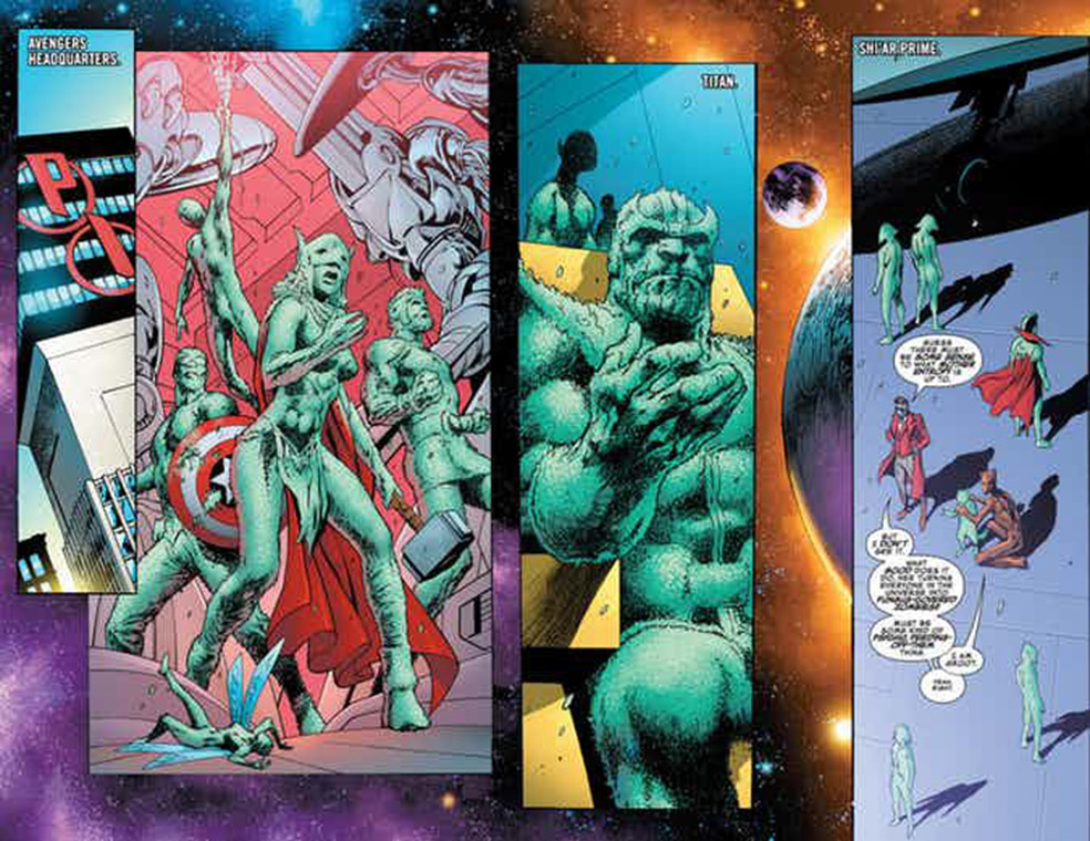 พวกแครอลยอมทำทุกอย่างเพื่อเอาพวกตัวเองรอด ไม่สนว่าคนบนโลกจะโดนกองทัพชิทอรี่ถล่ม คิดมุมนี้ก็ได้ใช่มะ กัปตันไฮดร้าคงเอาจุดนี้มาอ้างความชอบธรรมของตัวเองในการกำจัดฮีโร่แน่ ว่าแต่…ร็อคเก็ตคิดจะเรียกสตีฟว่าสตีวิลแฮะ (Steve + Evil = Stevil) ตูเรียกบ้างดีมั้ยเนี่ย