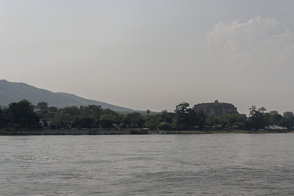 นั่งเรือมาประมาณ 40 นาทีเราก็ได้เห็นแล้วเจดีย์มิงกุน (Mingun Pagoda) ตั้งตระหง่านอยู่ริมน้ำ เจดีย์มิงกุนนี้แต่เดิมถูกวางแผนให้สร้างไปสูงมากๆ แต่ที่เหลือให้เห็นคือแค่ 1 ใน 5 ของเจดีย์เท่านั้นครับ ส่วนสาเหตุที่เหลือแค่นี้ไม่ใช่ว่าโดนเผาทำลายแต่อย่างใดแต่เป็นเพราะว่าที่ริมน้ำดินอ่อนสร้างไปก็พังๆๆ ไล่ออกสิครับใครเป็นวิศวกร