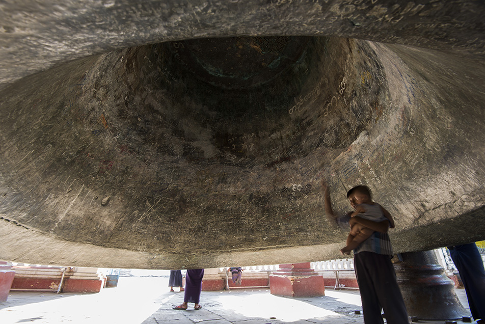 จุดต่อไปเราไปดูสิ่งที่รอคอย ระฆังยักษ์แห่งมิงกุน (Mingun Bell) ใหญ่จริงสมคำร่ำลือ ระฆังนี้หล่อมาเพื่อเป็นอนุสรณ์ว่าเจดีย์มิงกุนสร้างไม่เสร็จ (???) อันนี้น้องเค้าเล่าให้ฟังผมก็ไม่รู้ว่าน้องมั่วป่าว จุดนี้ห้ามใจอ่อนเพราะเด็กรอขอตังค์เยอะมาก เสียดายที่ที่สวยๆแบบนี้มีแต่คนมารบกวน