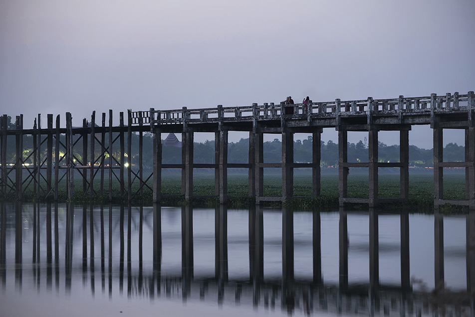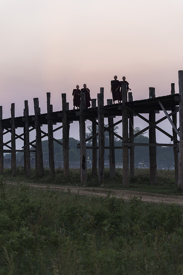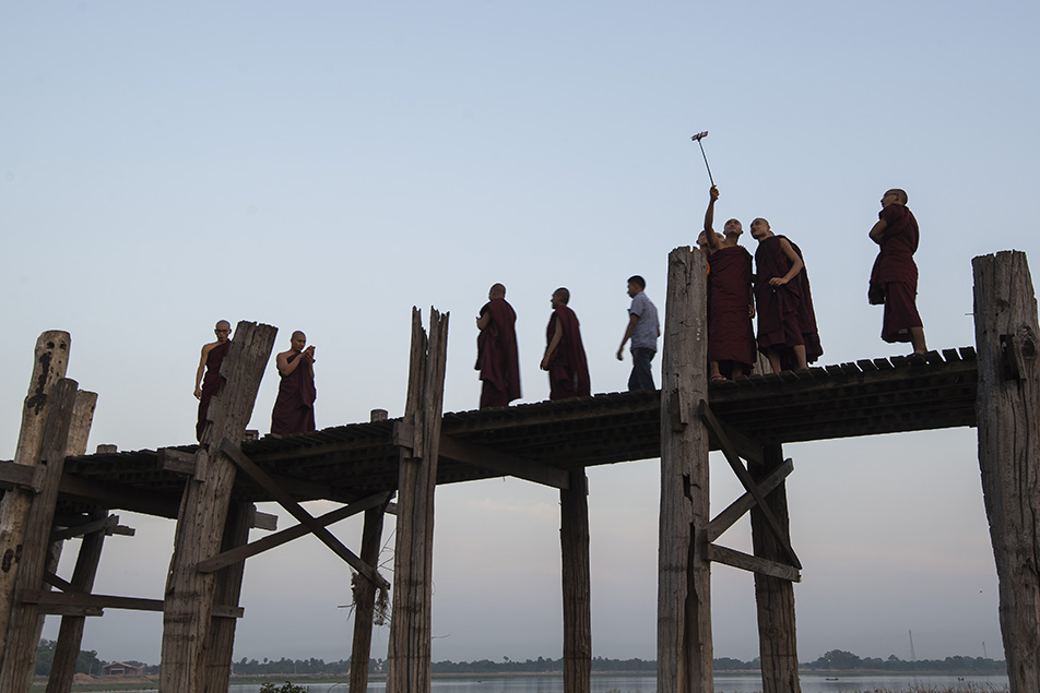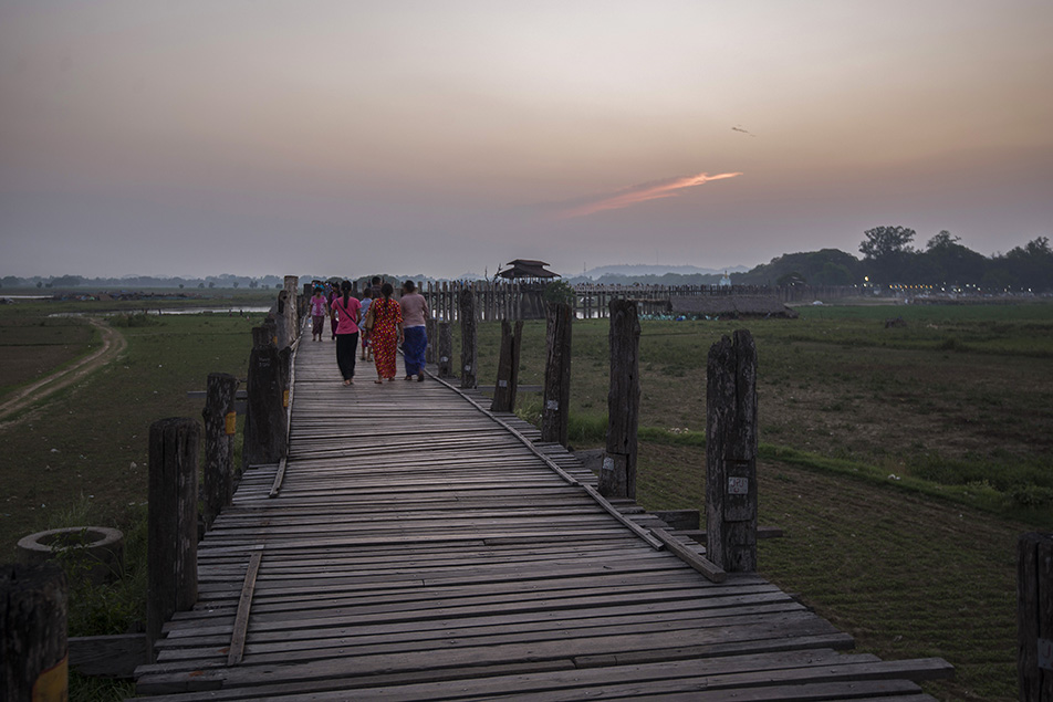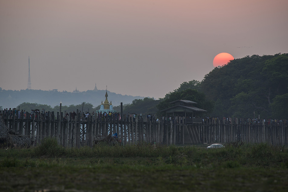 ก่อนเข้าโรงแรมที่พักเราไปดูพระอาทิตย์ตกต่อที่สะพานไม้สักที่ยาวที่สุดในโลก 1.2 ก.ม. สะพานอูเบ็ง (U Bein Bridge) ที่ทอดข้ามทะเลสาบตองตะมาน สะพานถูกสร้างจากเสาไม้สักที่เหลืออยู่จากการย้ายเมืองหลวงจากเมืองอังวะไปเมืองอมรปุระโดยมีเสาทั้งหมด 1,086 ต้นด้วยกันจ้า
