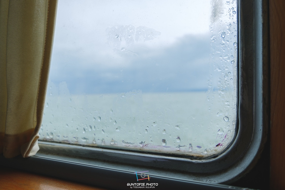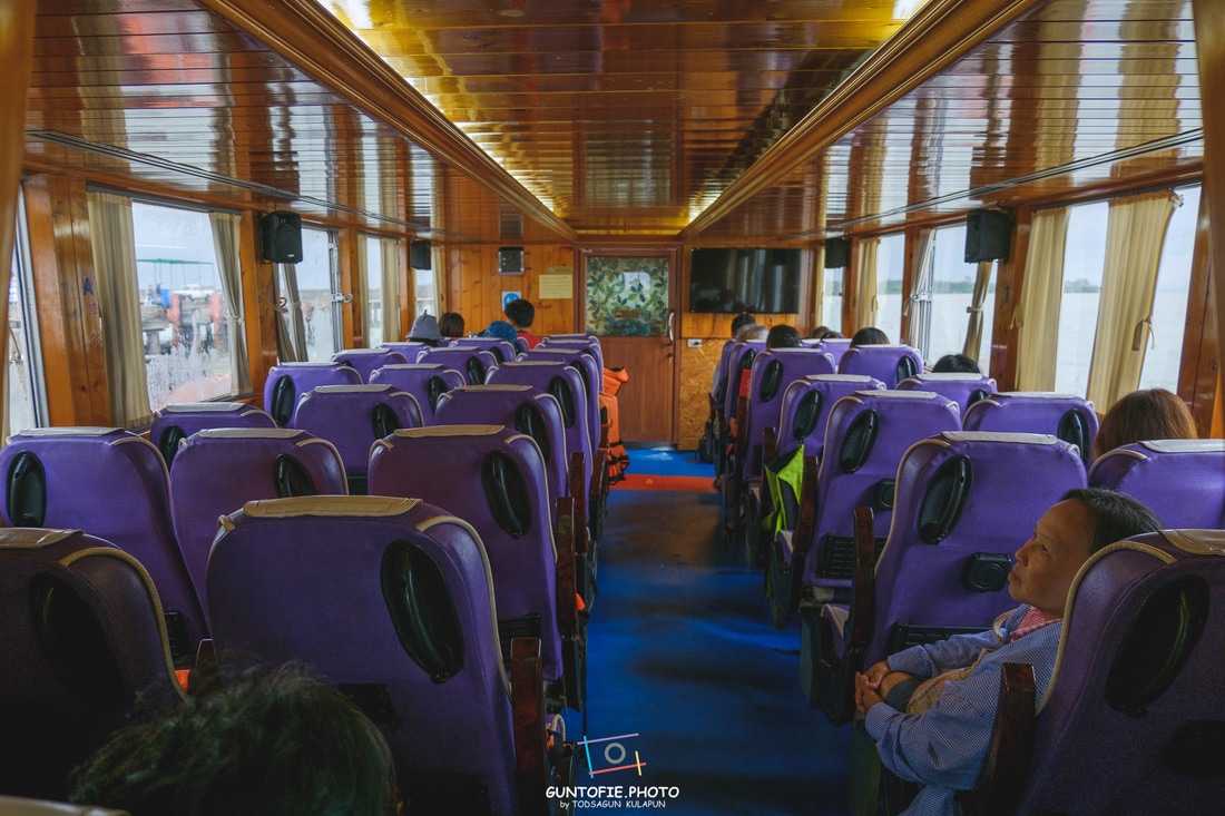 ถึงเวลาลงเรือแล้ววว...เวลาเที่ยงครึ่งก็มีรถสองแถวขนาดใหญ่มารับลูกค้าที่รอตรงออฟฟิตไปส่งลงเรือ ก่อนลงเรือพนักงานจะตรวจตั๋วแล้วถามเราว่าพักที่ไหนเพื่อจะได้จัดเตรียมแบ่งกลุ่มรถที่จะไปส่งตามรีสอร์ทที่พัก และให้เราเอากระเป๋าไปวางไว้จะมีพนักงานลงเรือให้ สภาพเรือเป็นเรือขนาดใหญ่ สองชั้นชั้นบนมีทั้งห้องแอร์และโซนรับลมธรรมชาติ ส่วนชั้นล่างเป็นห้องแอร์เช่นกันแอร์เย็นดี และมีห้องน้ำสะอาดดี ซึ่งแน่นอนว่าเราเข้าห้องแอร์เพราะฝนตกตลอดทางที่ไปเกาะกูด คลื่นลมไม่แรง บางช่วงมีโคลงบ้าง แต่ไม่น่ากลัว ทุกที่นั่งจะมีเสื้อชูชีพไว้ให้ประจำ แต่ผู้โดยสารมีทั้งใส่และไม่ใส่ ซึ่งในส่วนนี้อยากให้รณรงค์ให้มีการใส่เสื้อชูชีพกันทุกครั้งเพื่อความปลอดภัยในการเดินทางค่ะ