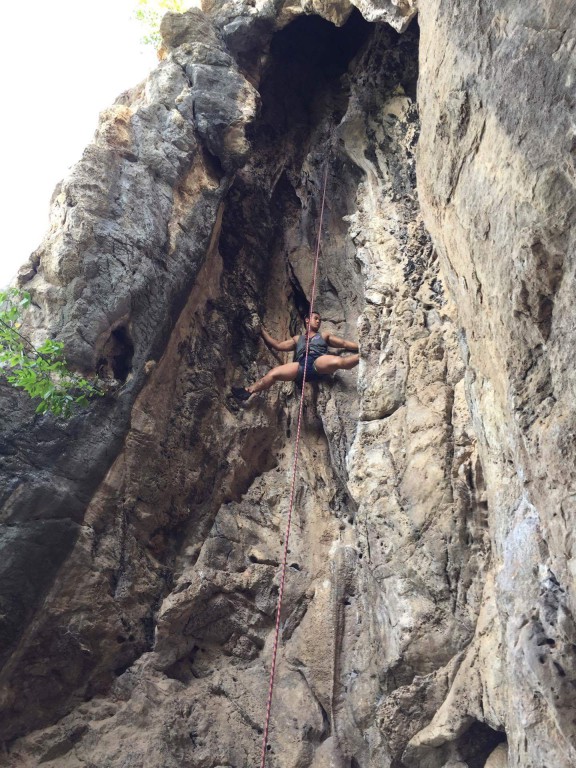 พวกเราใช้เวลาเดินสำรวจกันอยู่ราว 1 ชั่วโมง ก็พบจุดที่เหมาะแก่การปีนผาในวันนี้ ซึ่งนี่คือครั้งแรกของผมกับพี่ซีที่จะได้ลองปีนผา โดยเราค่อนข้างจะข้ามขั้นกันไปพอสมควร เพราะพวกเราได้มาฝึกกับพี่ดาวผู้ที่ชื่นชอบและมีทักษะในการเล่นกีฬาปีนผาเป็นอย่างดี โดยพี่ดาวเคยปีนผาได้ถึงในระดับ 7b เลยทีเดียว