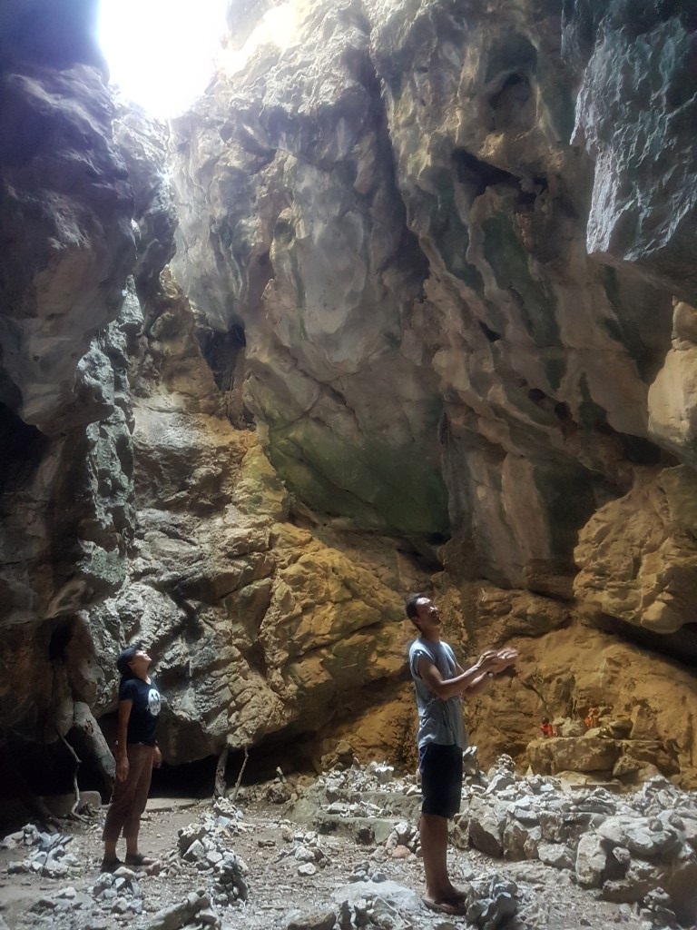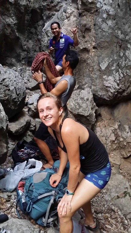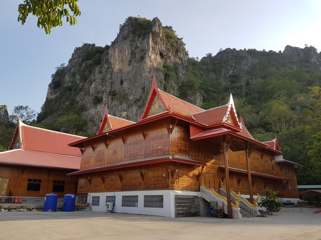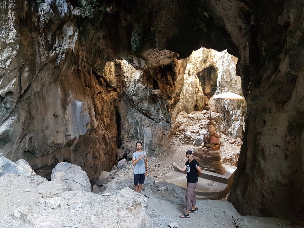 จากตีนเขา พวกเราเดินขึ้นบันไดวัดขึ้นมาเรื่อยๆ เดินตามทางมาจนถึงโพรงถ้ำที่ภายในมีพระพุทธรูปมีลักษณะคล้ายศิลปะแบบพม่าตั้งอยู่หนึ่งองค์ จากนั้นพวกเราก็เดินทะลุถ้ำไปอีกฝากหนึ่งของภูเขาหินเพื่อหาจุดปีนผาที่เหมาะ ตามที่พี่ดาวอาจารย์ของพวกเราในวันนี้เห็นควรว่าหน้าผาบริเวณไหนมีความเหมาะสมสำหรับการนำมาซ้อมปีนผาสำหรับผมกับพี่ซี ผู้ที่เป็น Beginner ในวันนี้