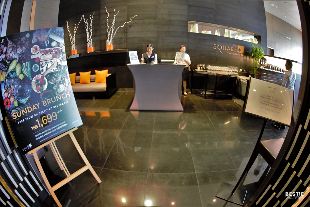 ห้องอาหารเดอะสแควร์ อยู่บนชั้น 8 ของโรงแรมโนโวเทล กรุงเทพ เพลินจิต สุขุมวิท ถ้าใครมาทางรถไฟฟ้าก็เดินออกทางออก 4 และจะเจอโรงแรมอยู่ด้านขวามือข้างบรรไดรถไฟฟ้าเลยล่ะ เสร็จแล้วเดินขึ้นลิฟต์มาที่ชั้น 8 จะพบกับพนักงานยืนรอต้อนรับทุกคนอยู่