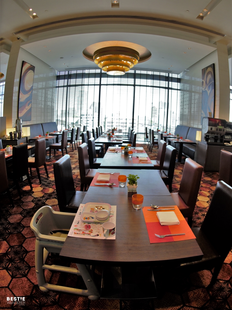 ภายในห้องอาหารดูโปร่งโล่งสบาย ด้านข้างเป็นหน้าต่างทรงสูงเห็นวิวตึกด้านข้างและรถไฟฟ้า ตกแต่งด้วยเฟอร์นิเจอร์สีน้ำตาลเข้มดูอบอุ่น สบายตา แซมด้วยแก้วและ plate mat สีสีมสดใส ถ้ามีเด็กๆมาด้วยทางห้องอาหารจะจัดเก้าอี้เด็กและชุดจานสำหรับเด็กลายน่ารักๆไว้ให้ด้วยค่ะ