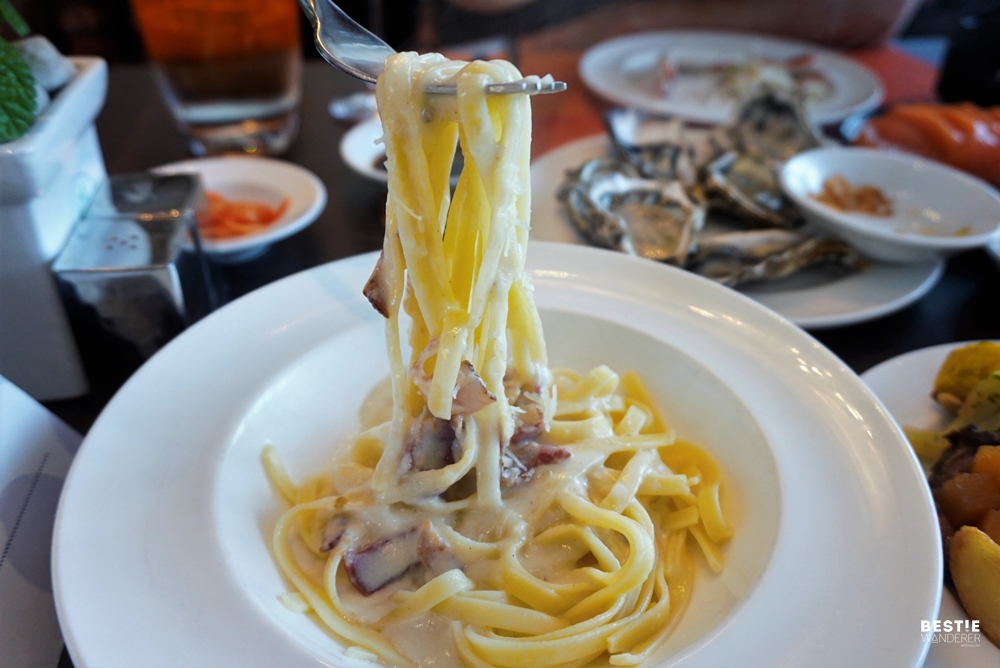 ที่ห้องอาหาร The Square นี้เค้าเน้นเรื่องการ cook to order ทำสดใหม่ทุกจานจริงๆนะคะ พาสต้า station เชฟก็ทำกัดสดๆ จานต่อจานกันเลยทีเดียว เราลองสั่งสปาเหตตี้คาโบนาร่ามาทาน คือหอมชีสและอร่อยกล่มกล่อมมากๆ เบค่อนก็กรุบกรอบกำลังดี ณ จุดนั้นลืมเรื่องไดเอทไปเลยจริงๆนะบอกตรงๆ ฮ่าๆๆ