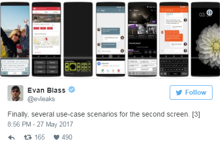 หน้าจอรองจะสามารถมองเห็นได้เล็กน้อยเมื่อซ่อนอยู่ภายใต้หน้าจอหลัก นั่นหมายความว่า คุณจะยังคงได้รับการนำเสนอจอแสดงผลรองที่แสดงผลอยู่ตลอดเวลาเช่นเดียวกับรุ่นก่อนหน้า แต่เมื่อมีการขยาย หน้าจอรองจะสามารถนำเสนอฟังก์ชั่นต่างๆ ได้โดยอิงกับแอปฯที่กำลังทำงานอยู่ คล้ายๆ การทำงานของ Touch Bar ใน MacBook Pro รุ่นใหม่ล่าสุด ภาพแนวคิดนี้ยังแสดงให้เห็นว่า หน้าจอแสดงผลจะยังใช้เป็นแป้นพิมพ์เหมือน BlackBerry Priv อีกด้วย
