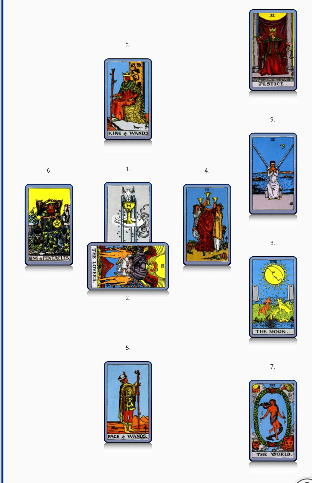 1. The Tower 2. The Chariot 3. THE NINE OF WANDS 4. FIVE OF SWORDS 5. The Fool 6. THE PAGE OF SWORDS 7.THE QUEEN OF WANDS 8.THE QUEEN OF SWORDS 9. The Devil 10. ACE