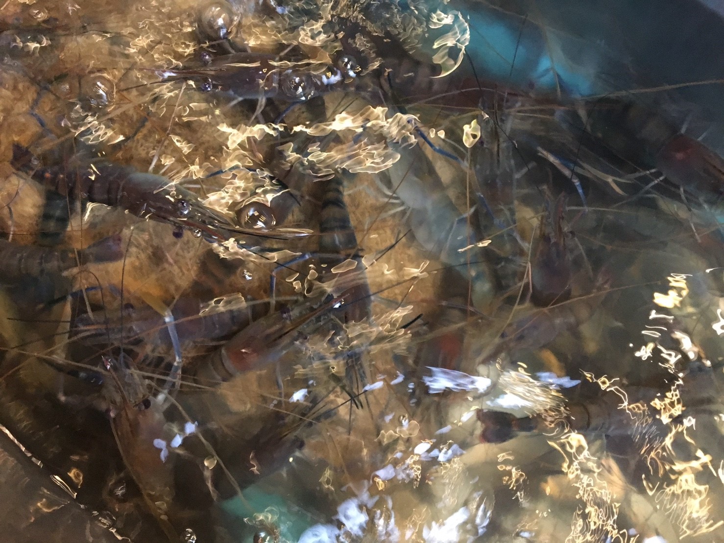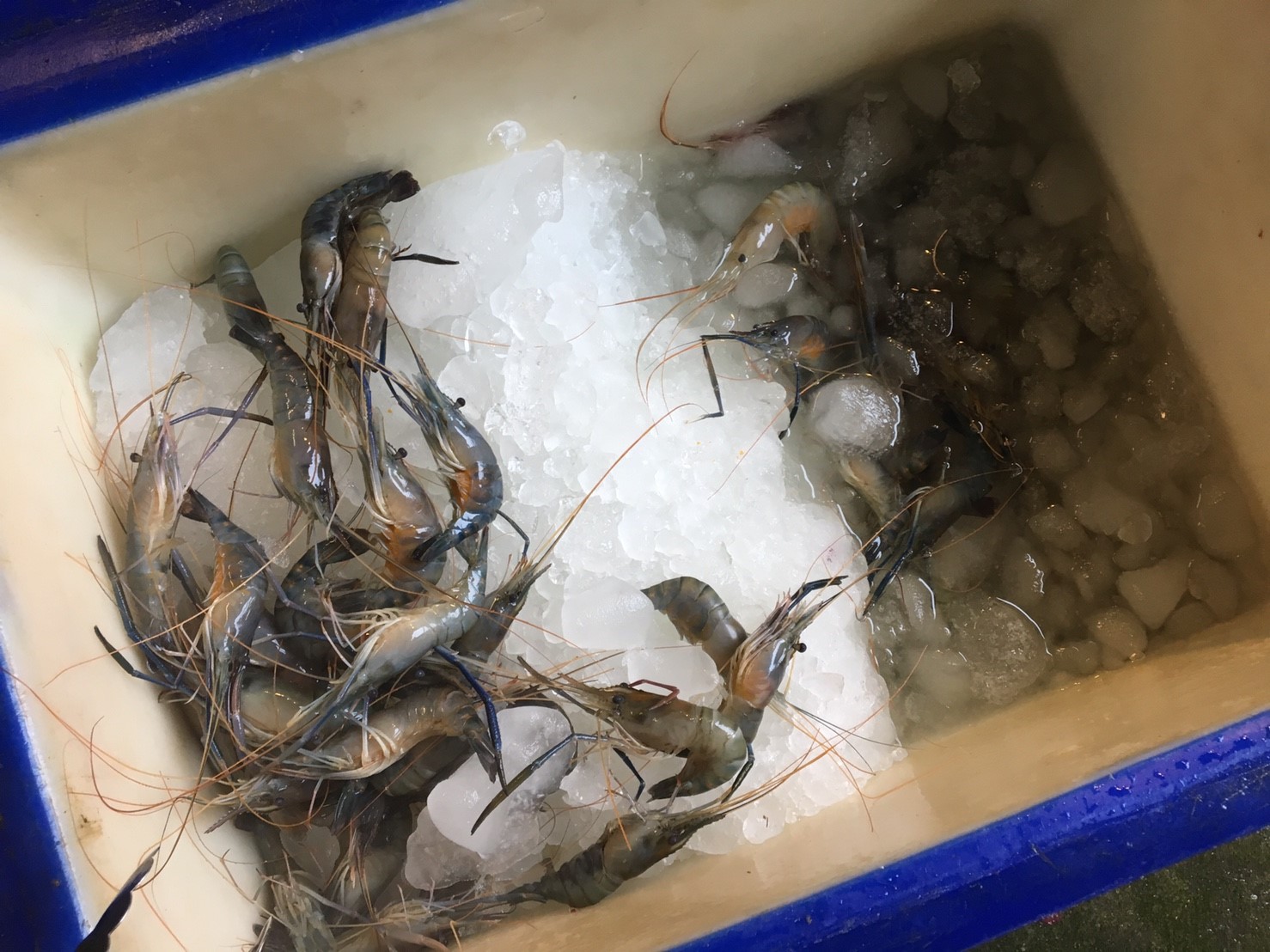 ถ้าเลื่อนขึ้นไปตรงรูปปูจะเห็นกุ้งอยู่ทางขวา พอดีถ่ายมาไม่หมดมันล้นเฟรม และกุ้งตัวยังไม่ใหญ่ถึงใจเท่าไร แนะนำให้เดินไปทางขวาสุด จะพบกับป้ายที่เขียนว่า "กุ้งเป็นๆ" เป็นตัวๆ ตัวใหญ่ๆ ยังดิ้นๆอยู่ และกำลังปั้มออกซิเจนกันอยู่เลยจ้าาาา หยิบตะกร้าและที่คีบมาค่ะ หนีบในบ่อไปได้เลย โอ้ยยย พีคมากก