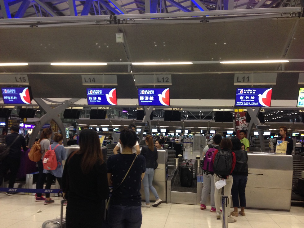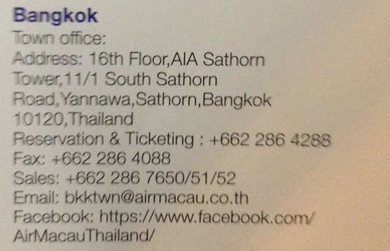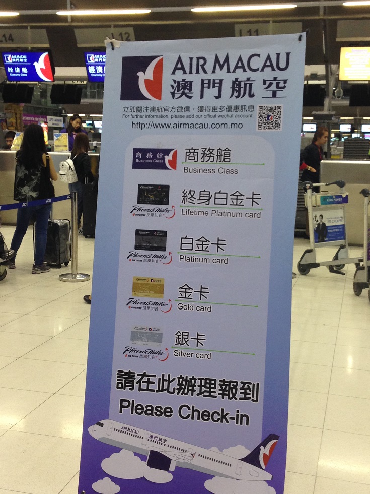 ขึ้นเครื่องที่ท่าอากาศยานสุวรรณภูมิ กรุงเทพฯ อาคารผู้โดยสารขาออกระหว่างประเทศ ชั้น 4 เคาน์เตอร์ L ใช้เวลาเดินทางประมาณ 2 ชั่วโมง 35 นาที ถึงท่าอากาศยานนานาชาติมาเก๊า Macau International Airport (IATA: MFM, ICAO: VMMC) (มาเก๊าเวลาเร็วกว่าประเทศไทย 1 ชั่วโมง)