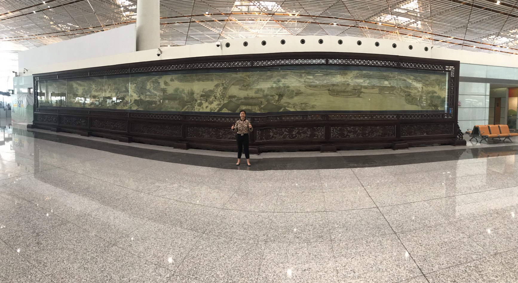 ไปถึงสนามบินปักกิ่งแล้วอย่าลืมถ่ายภาพวาดกำแพงเมืองจีนขนาดยักษ์และยาวมาก ส่วนนี้อยู่ในส่วนที่ผู้โดยสารขาเข้า หลังจากเราผ่าน ตม.ที่ Terminal 3 มาแล้วนะคะ