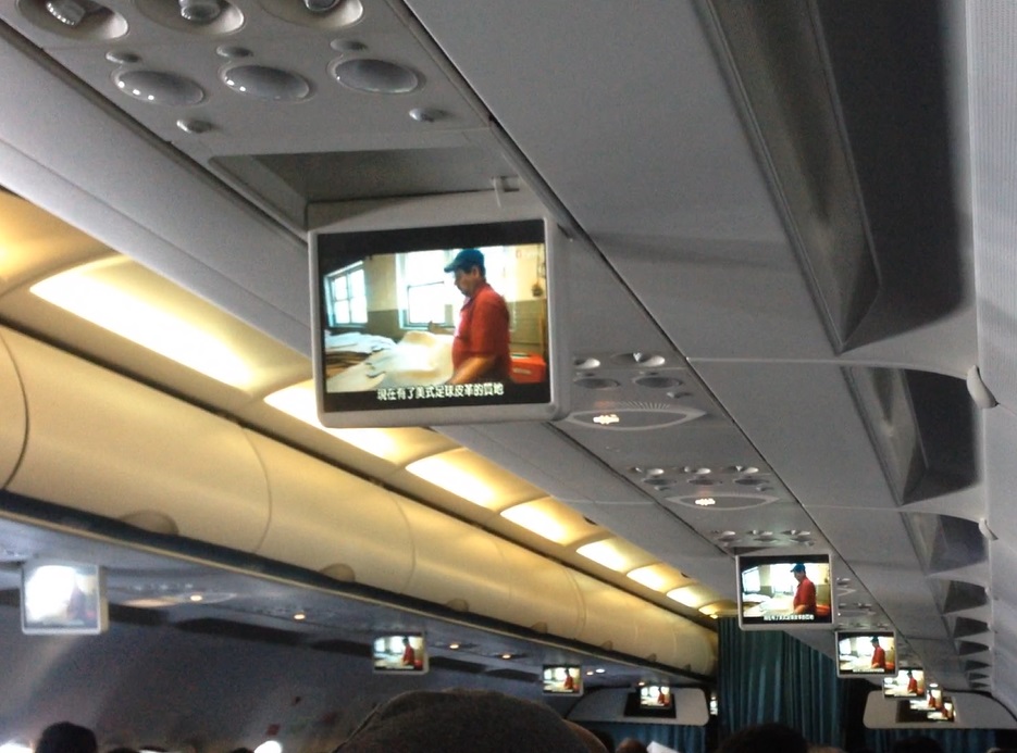 ไม่มี PTV แต่มี TV ฉายโฆษณาหรืออะไรไม่รู้อยู่บนหัว ดูเรื่องเดียวกันทั้งลำ และมีหูฟังให้ฟัง น่าจะเป็นภาษาจีน (ไม่ได้ลองฟังน่ะค่ะ)