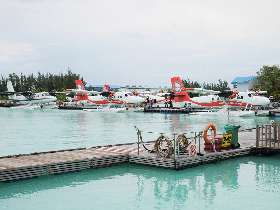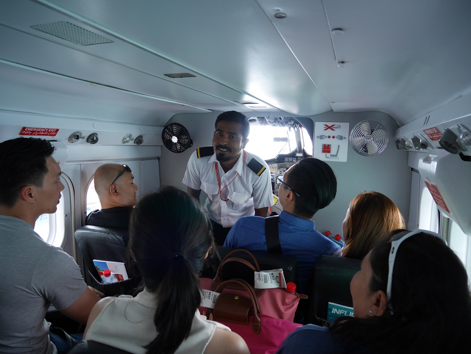 เครื่องบินใช้เวลาเดินทางประมาณ 4 ชั่วโมง 15 นาที ก็จะถึงสนามบิน Velana International Airport (MLE) อยู่ที่มาเล่ เมืองหลวงของประเทศมัลดีฟส์ เมื่อผ่านออกมาด้านนอกจะมีเจ้าหน้าที่ถือป้ายชื่อโรงแรมรอรับอยู่ เราก็เดินเข้าไปหาแจ้งว่าพักที่ Centara Grand เจ้าหน้าจะพาไปเชคอินที่ Trans Maldivian Airways แล้วส่งเราขึ้นรถบัสเพื่อไปขึ้น Sea plane ค่ะ เราต้องรอไฟล์ทบินของเราอีกประมาณชั่วโมงกว่าๆ บริเวณที่รอก็จะมีร้านเล็กๆขายอาหารและเครื่องดื่ม และมี free Wi-Fi ค่ะ แน่นอนสิ่งแรกที่ทำก็คือเชคอินในเฟซบุ๊คซิคะจะรออะไร ^^ เมื่อใกล้ถึงเวลาบินเจ้าหน้าที่จะประกาศเรียก หรือเราดูจากจอแสดงไฟล์ทและเวลาบินเองก็ได้ค่ะ เดินไปรอที่ห้องเล็กๆใกล้ๆกันนั้นแหละ แต่ห้องนี้มีแอร์และมีน้ำดื่มขวดเล็กให้ฟรี รอไม่นานเจ้าหน้าที่จะมานำไปที่เครื่องบินค่ะ