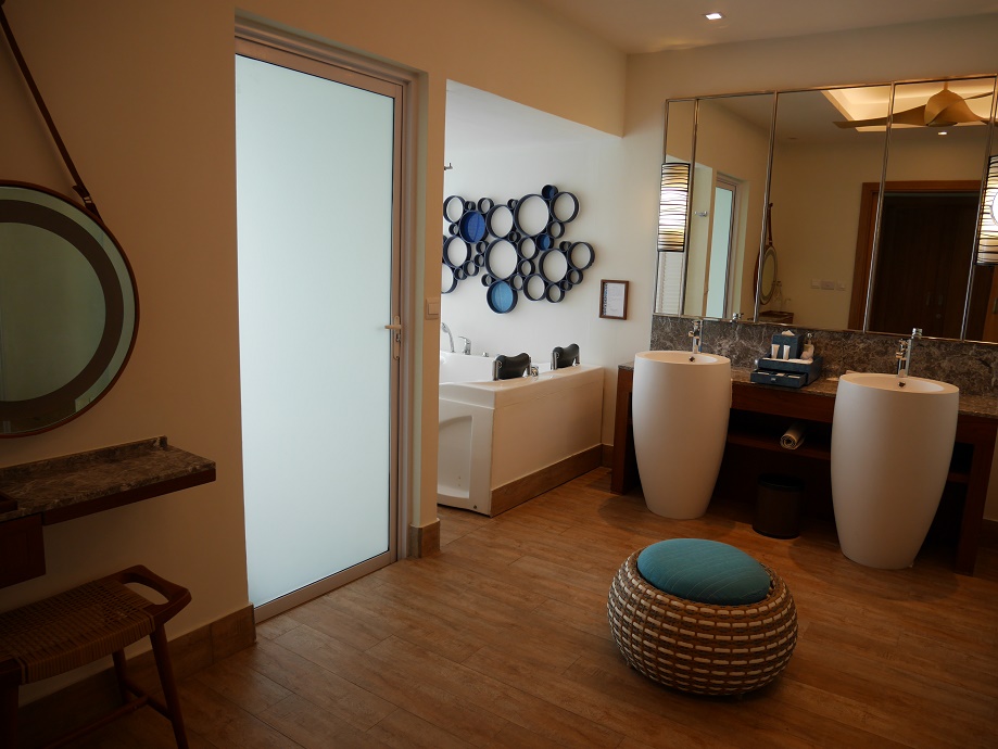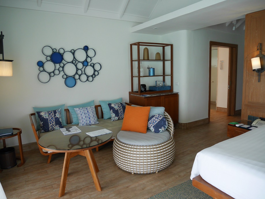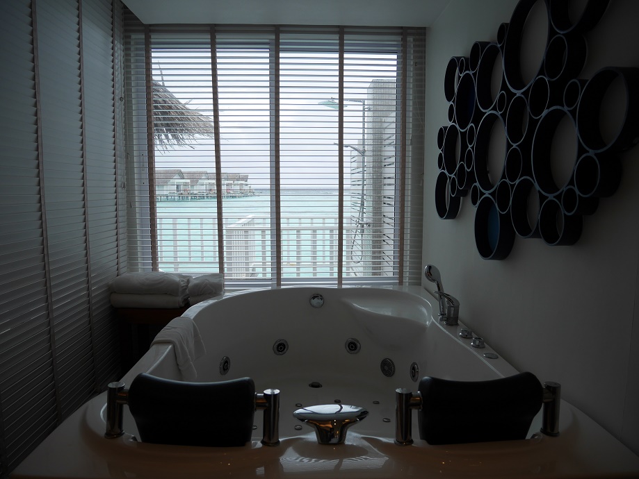 ห้องพักเราเลือกแบบ Deluxe Water Villa ซึ่งเป็นห้องพักกลางน้ำที่ราคาถูกที่สุดของรีสอร์ท (แค่นี้ก็ทะลุงบที่ตั้งไว้มาหน่อยๆแล้วค่ะ) ห้องกว้างขวาง เตียงนอนสบายหันหน้าออกทะเล ระเบียงมีตะข่ายให้นั่งเล่น ห้องน้ำใหญ่พอๆกับห้องนอน โดยแยกห้องส้วม ห้องอาบน้ำ และอ่างจากุซซี่ อุปกรณ์จำเป็นครบครัน ปลั๊กไฟเสียบได้เลยไม่ต้องใช้ International plug adapter มินิบาร์ทานได้ทุกอย่าง เติมให้วันละ 1 ครั้ง ถ้าแจ้งว่ามาฮันนีมูนให้เอาการ์ดแต่งงานมาโชว์ด้วยหรือรูปถ่าย จะได้ไวน์ 1 ขวด และชอคโกแลต 1 จาน