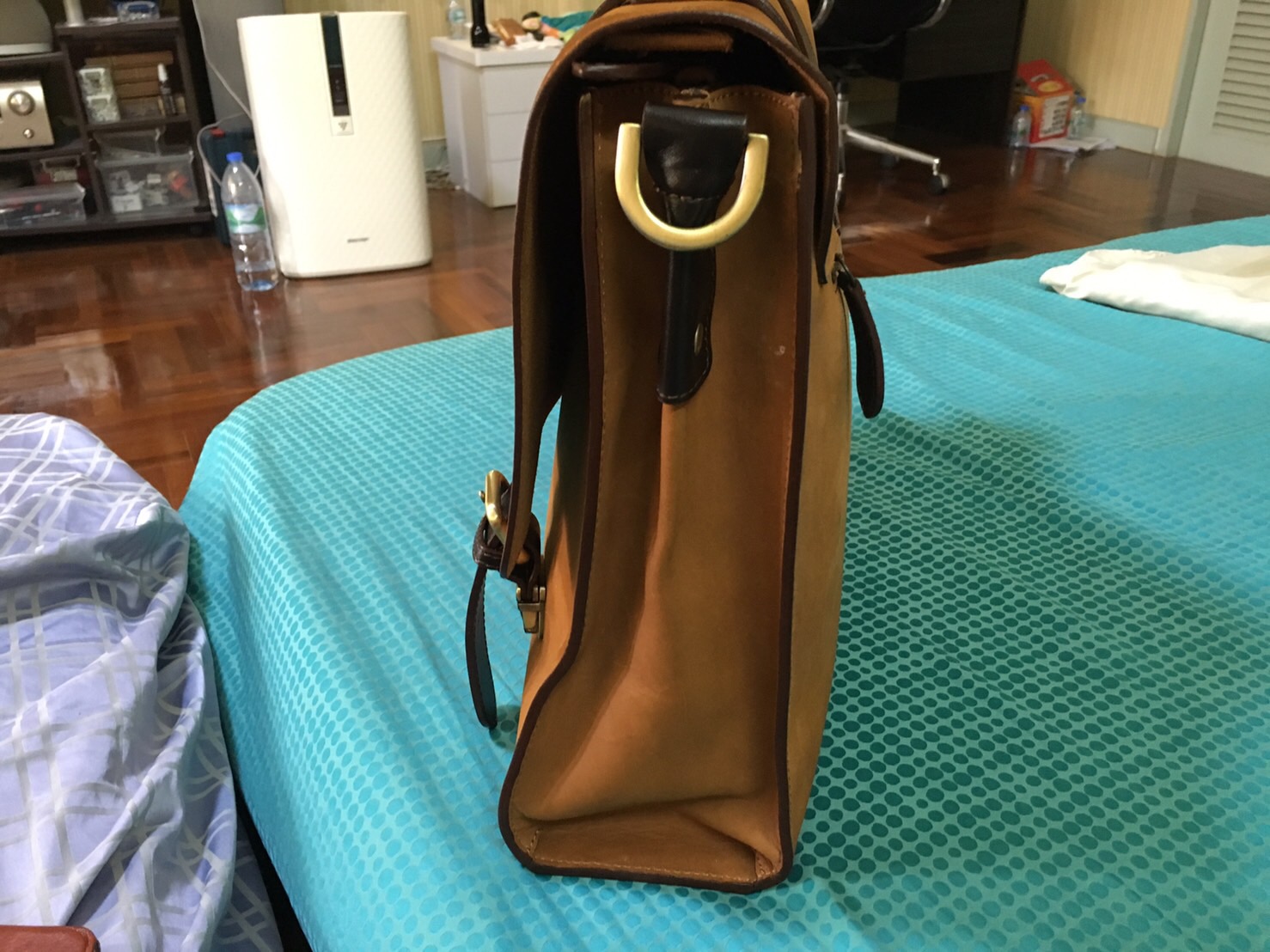 ส่วนทางด้านข้างของกระเป๋าจะมีห่วงทองเหลือง ทั้งสองด้านครับไว้เผื่ออยากใส่สาย หรือถอดสายตามความชอบการใช้งาน และแน่นอนครับห่วงที่ใช้เกี่ยวสายสะพายก็ทำมาจากทองเหลืองคุณภาพดีเช่นกัน
