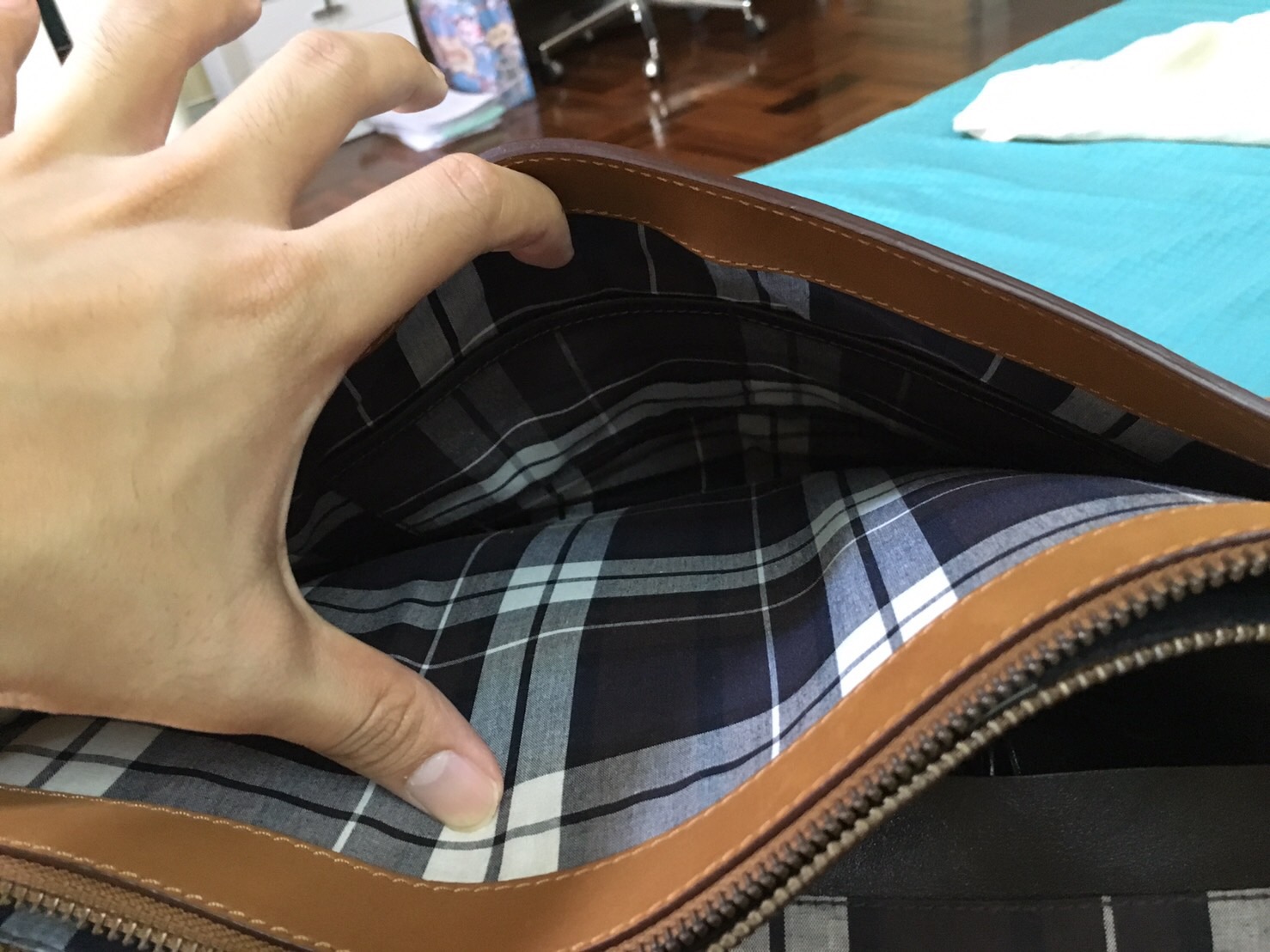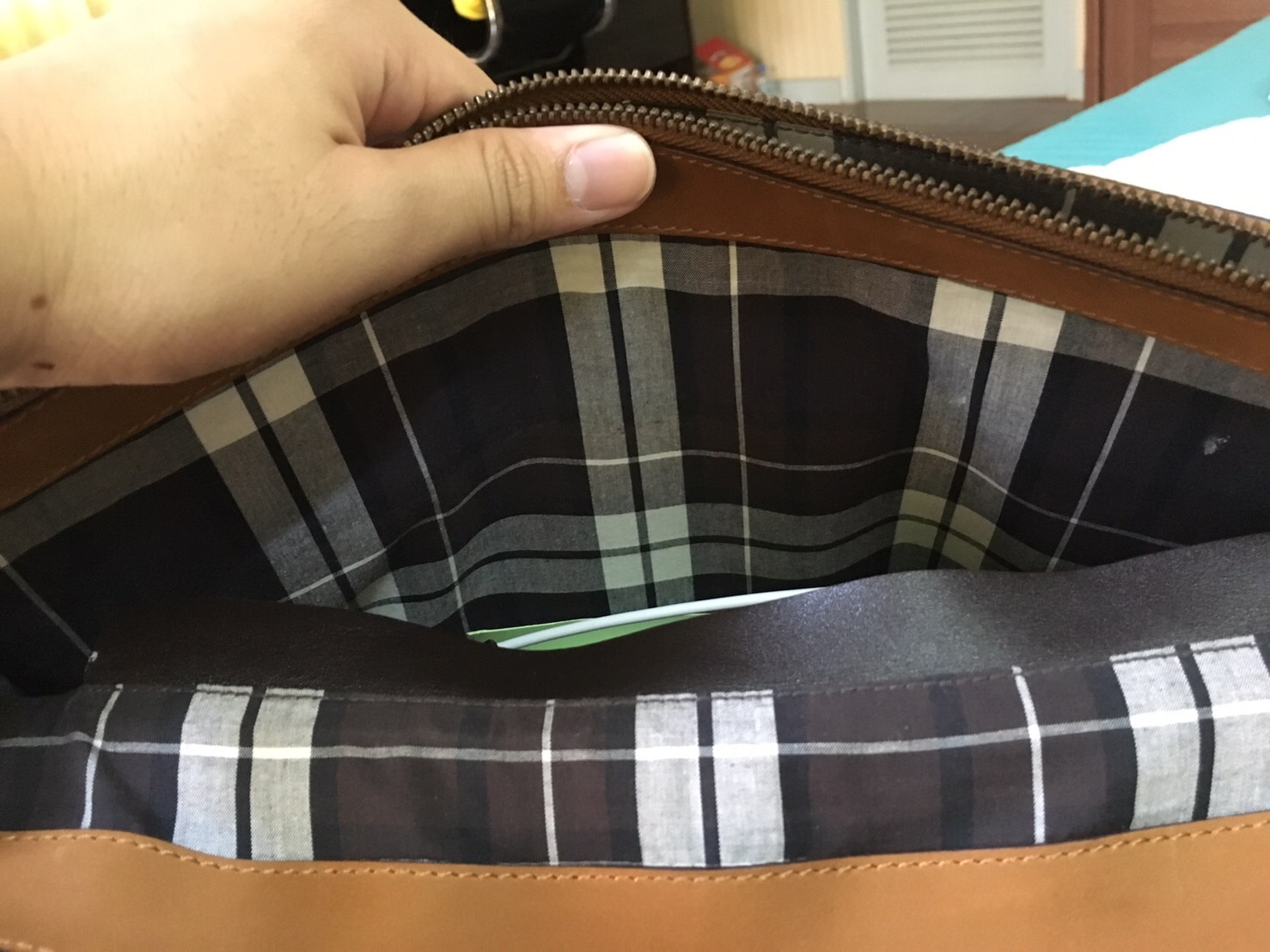 ต่อมาเรามาชมด้านในกระเป๋ากันบ้างครับ signature ของแบรนนี้จะบุภายในกระเป๋าด้วยผ้าลายสก็อตคุณภาพดีจากญี่ปุ่นครับ