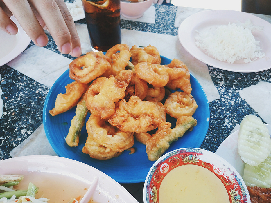 เมนูที่สั่งก็จะมี ชุดน้ำพริกปลาทู, ต้มส้มปลาหมึกยัดไส้หมู, ทอดมันปลากราย, ปลาหมึกชุบแป้งทอด