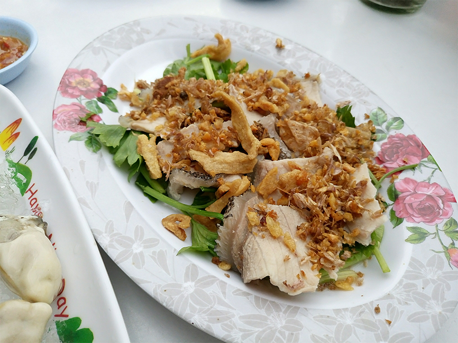 คือโรยด้วยกากหมู กระเทียมเจียว เพลิกกับกากหมูมาก เนื้อปลาสดดี