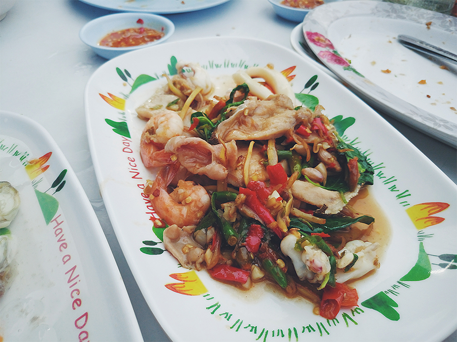เมนูที่สั่งก็จะมีหมูกรอบผัดพริกเผา, หอยนางรม, ผัดฉ่าทะเล, ปลาลวก, หอยจ๊อ, ผัดซีอิ๋วปู จริงๆมีสั่งราดหน้าทะเลด้วยแต่ไม่ได้ถ่ายไว้