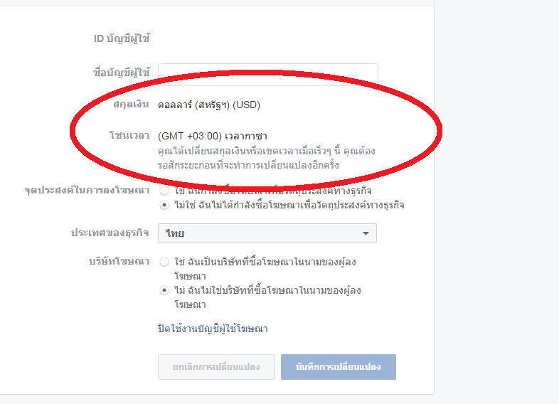 เนื่องจากโฆษณาในเเฟนเพจไม่ได้ เคยดูเขาสอนในยูทูป บอกให้เปลี่ยนโซนเวลา และสกุลเงิน แล้วเปลี่ยนกลับคืน ตอนนี้มีปัญหาเปลี่ยนกลับคืนไม่ได้