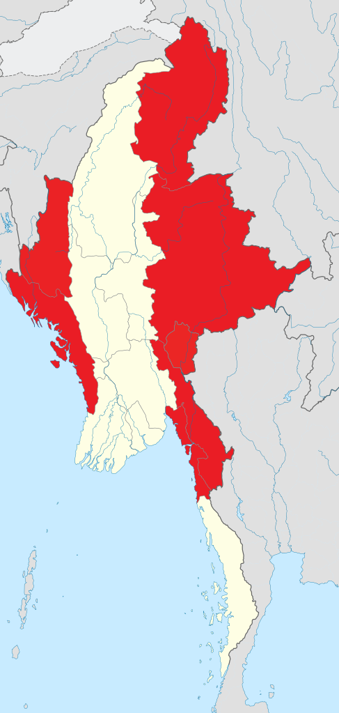 แผนที่ข้างบน คือ แผนที่ของประเทศเมียนมาร์ ส่วนที่เป็นสีแดงคือเขตของ "รัฐ" (States) ที่ถูกประกาศไว้ชัดเจนว่าเป็นพื้นที่ของชนกลุ่มน้อยและถูกจัดไว้ให้แยกออกจากเขต (Regions) ซึ่งเป็นเขตที่รัฐบาลกลางปกครองโดยตรง หรือในแง่โดยพฤตินัยก็คือ เป็นพื้นที่สำหรับชาวพม่า 100%