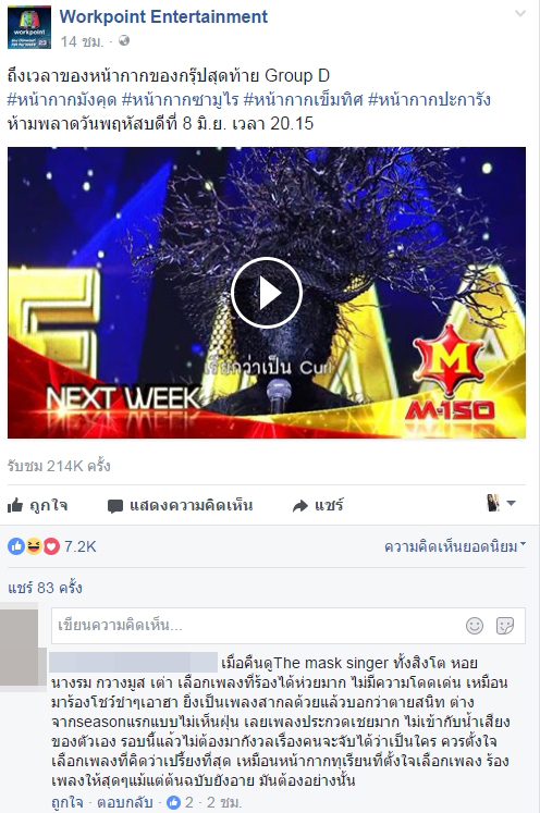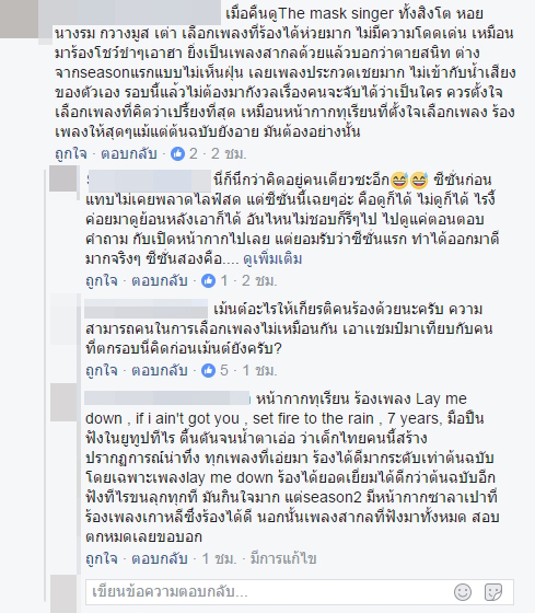 [Spoil] คลิกเพื่อดูข้อความที่ซ่อนไว้เมื่อคืนดูThe mask singer ทั้งสิงโต หอยนางรม กวางมูส เต่า เลือกเพลงที่ร้องได้ห่วยมาก ไม่มีความโดดเด่น เหมือนมาร้องโชว์ขำๆเอาฮา ยิ่งเป็นเพลงสากลด้วยแล้วบอกว่าตายสนิท ต่างจากseasonแรกแบบไม่เห็นฝุ่น เลยเพลงประกวดเชยมาก ไม่เข้ากับน้ำเสียงของตัวเอง รอบนี้แล้วไม่ต้องมากังวลเรื่องคนจะจับได้ว่าเป็นใคร ควรตั้งใจเลือกเพลงที่คิดว่าเปรี้ยงที่สุด เหมือนหน้ากากทุเรียนที่ตั้งใจเลือกเพลง ร้องเพลงให้สุดๆแม้แต่ต้นฉบับยังอาย มันต้องอย่างนั้น
