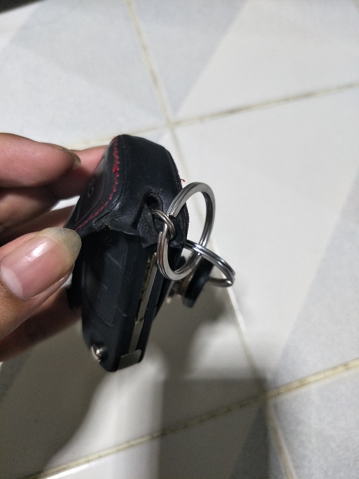 แถมรูปหนังหุ้มกุญแจรถที่ขาดมาได้ยังไง ที่จริงตัวกุญแจส่วนที่ไว้เสียบ start รถก็บิดงอด้วยครับ แต่ศูนย์แก้ให้แล้ว