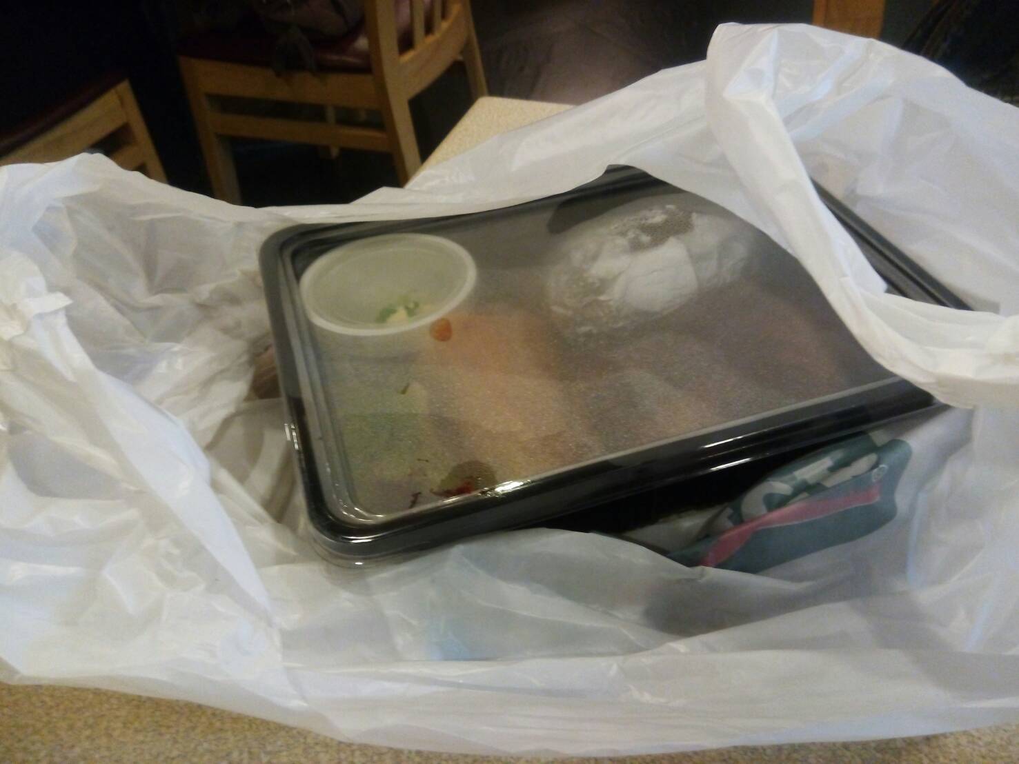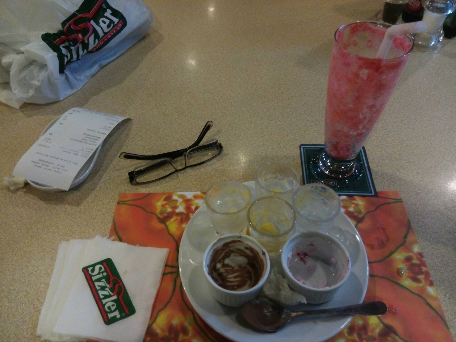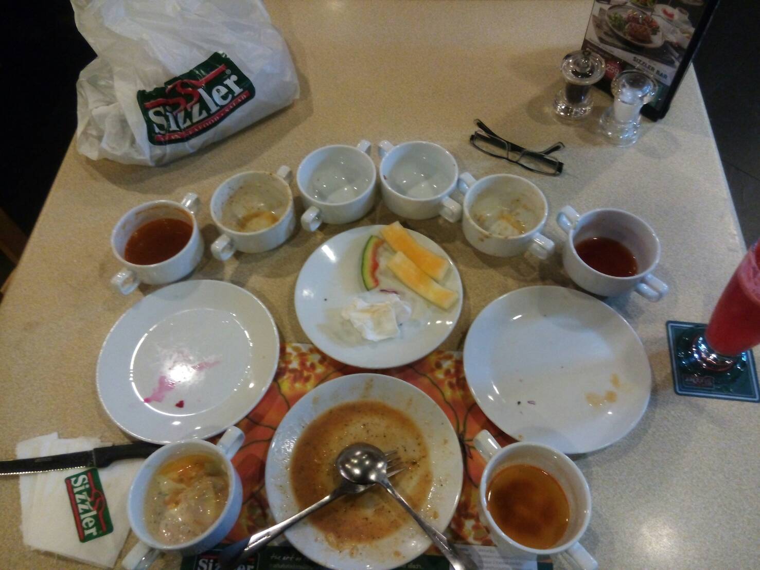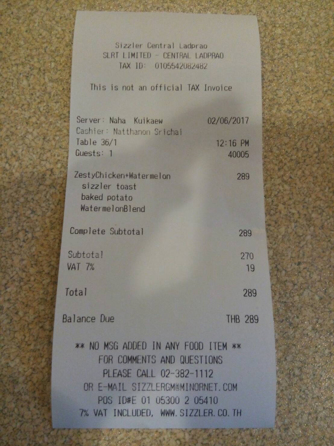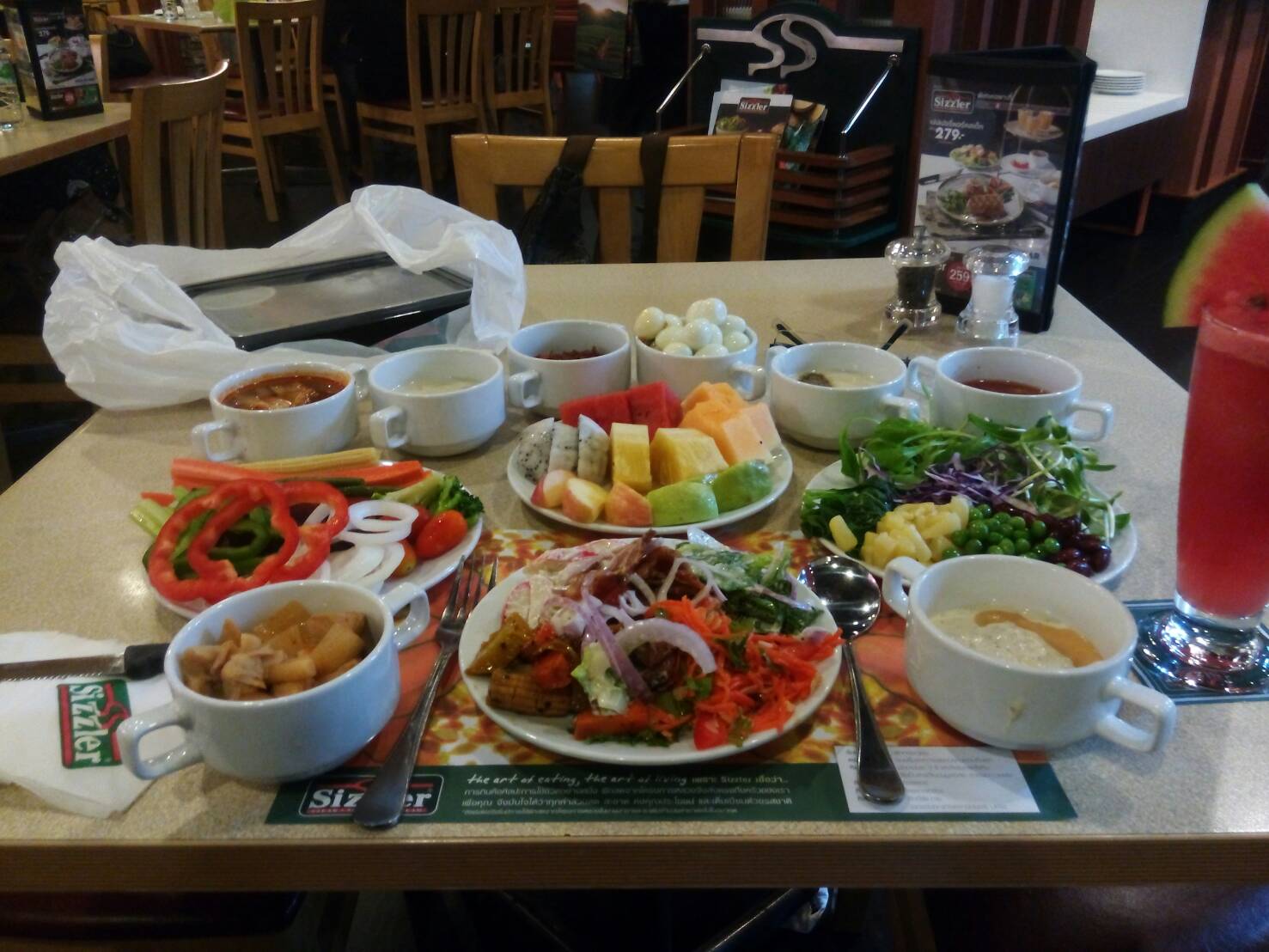 ตอนนั้นคิดว่าราคาอยู่ที่ 234.- (จริงๆ 214.-) เลยคิดว่าสเต๊กไก่กับส่วนเพิ่มมาเป็นน้ำแตงโม เพิ่มมาแค่ 55.- ก็เลยสั่งชุดนี้ (จริงๆแพงขึ้น 75.- พอมากินสเต็กไก่ที่บ้าน ก็คิดว่าน่าจะกินสลัดบาร์ก็พอ)