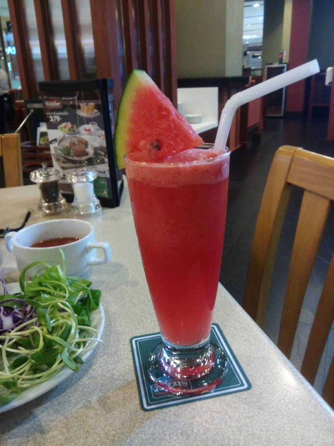 พอมาถึงหน้าร้านเห็นป้ายโปร เป็นชุดสเต๊กไก่ กับน้ำแตงโมปั่น ราคา 289.- แพงกว่าที่กินแต่สลัดบาร์กับน้ำโซดานิดหน่อย