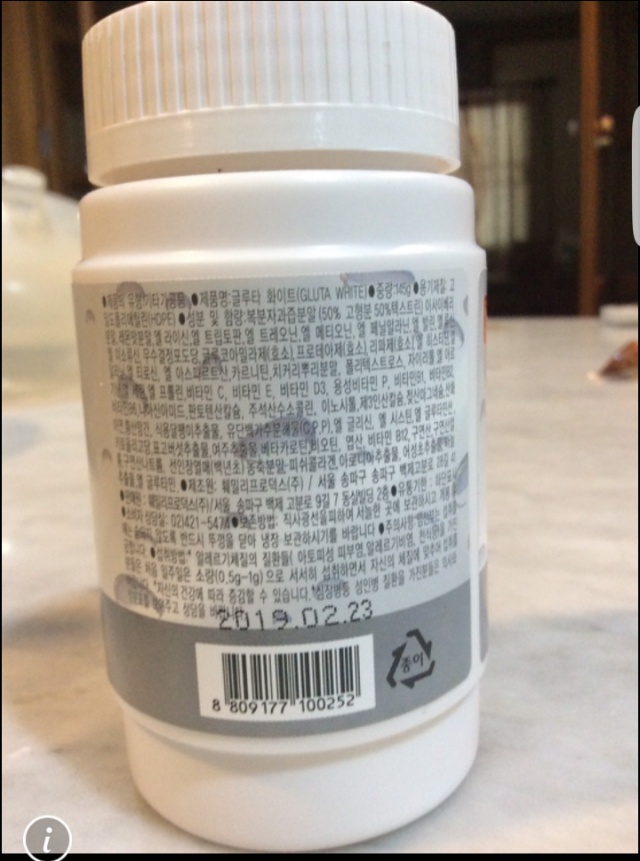 เราดูจากฉลากมีแต่ภาษาเกาหลี มีภาษาอังกฤษคำเดียวคือ Gluta White เราว่าเอ๊ะ มันจะใช่เหรอ สรรพคุณที่บอกมา อันนี้มันกินเพื่อผิวขาวไม่ใช่หรือคะ? เกรงว่าพ่อจะถูกหลอกขายยาค่ะ เพราะขวดนึงไม่ใช่ถูกๆหลายพันบาท ฉลากก็ไม่มีบอกอะไรที่พอจะรู้เลย