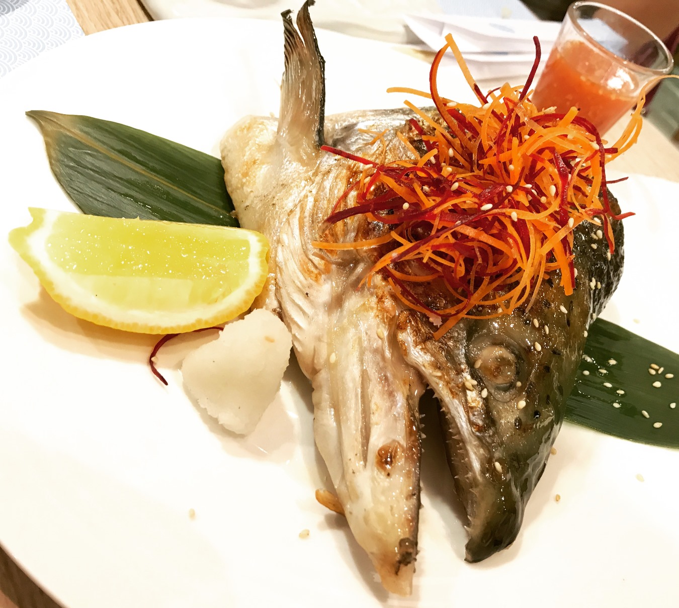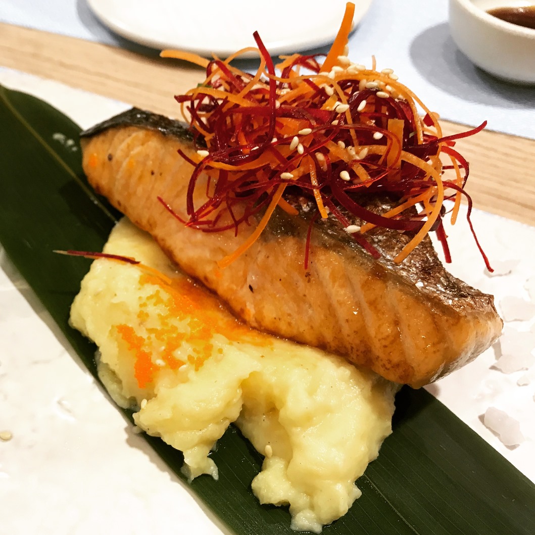 จากนั้นทางร้านก็เดินมาถาม อิ่มกันหรือยังคะ/ครับ เราก็เอ๊ะ...มีอะไรหรอ เซอร์ไพรส์จ้า!!! แถมเมนู Salmon Kabutai มาอีก จขกท. เคยกินแต่เป็นซุปหัวปลา พอได้มาลองแบบนี้ บีบเลมอน ราดน้ำจิ้มซีฟู้ดแล้วแซ่บหลาย ปลาเนื้อชุ่มฉ่ำ เปรี้ยวเผ็ดนิด ๆ กำลังดี คือเหมาะกับคนไม่กินเผ็ดมากอย่างผมเลย (ไม่รู้ใช่ซีฟู้ดเปล่านะ เห็นมันเปรี้ยวเผ็ดเลยเรียกเอง สีส้ม ๆ แนวน้ำยำอะครับ)