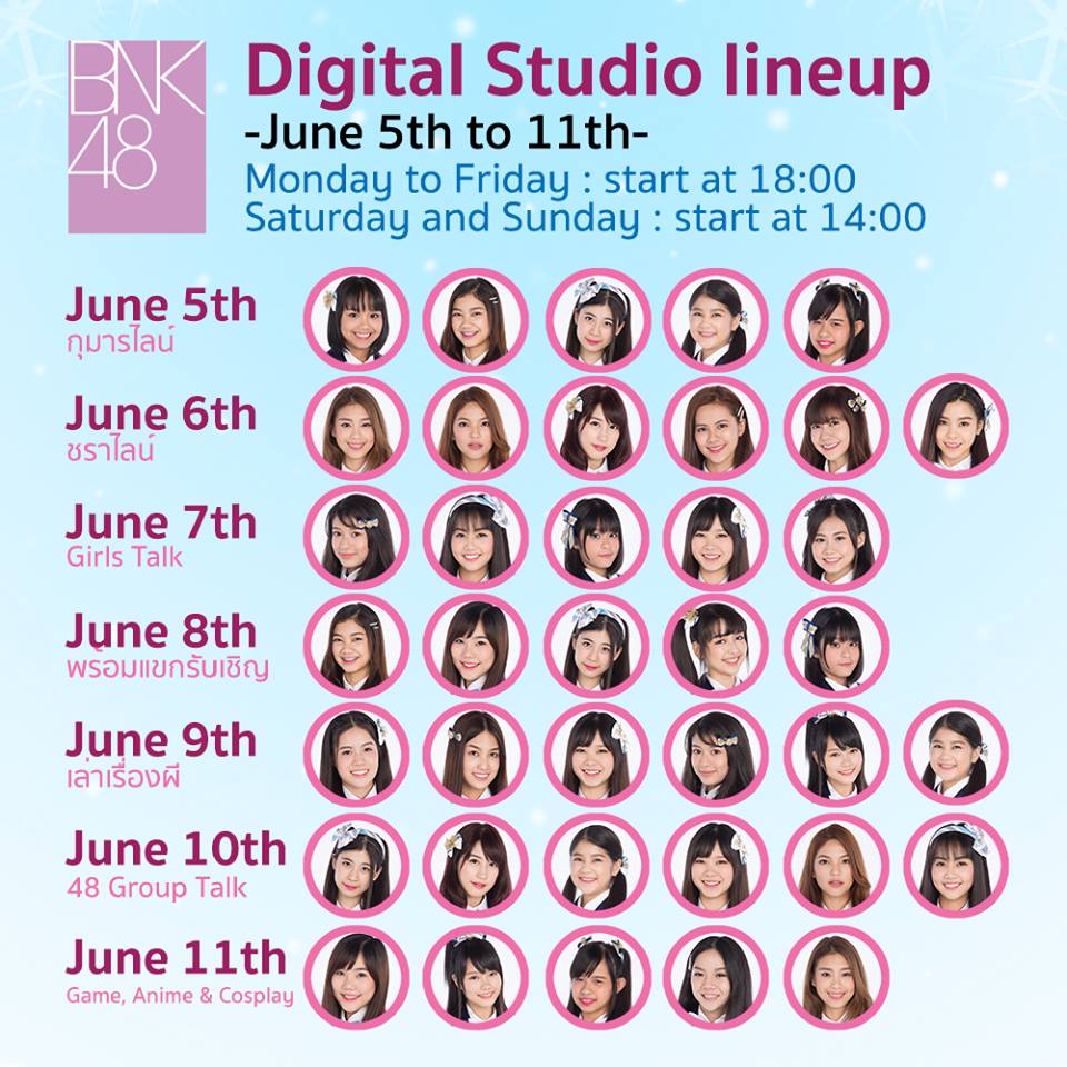 ตารางการปรากฎตัวของสมาชิก BNK48 ที่ Digital Studio วันที่ 5 มิถุนายน ถึง 11 มิถุนายน พ.ศ. 2560 มาแล้วครับ