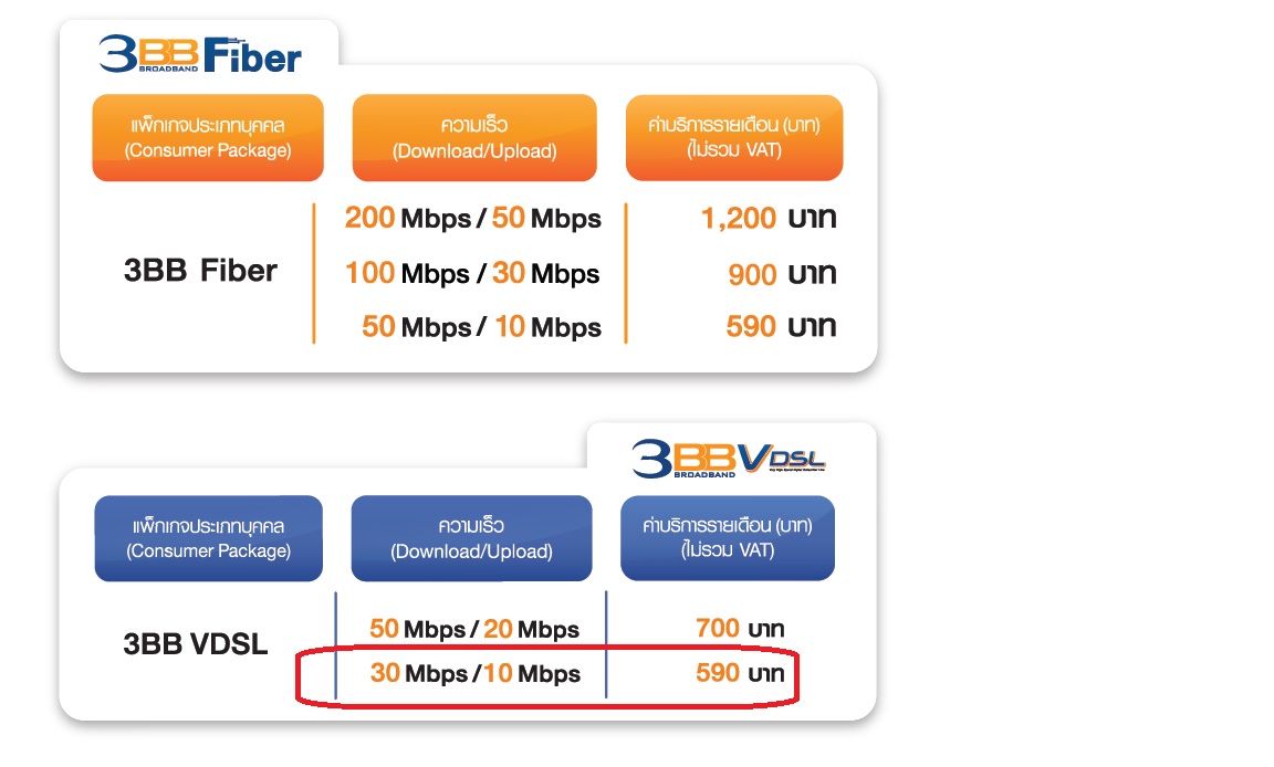 หากท่านต้องการเปลี่ยนแปลง Package มาใช้งานเป็น FTTx ซึ่งมีความเร็วเริ่มต้นที่ 50/10 Mbps ในราคา 590 บาท (ไม่รวม VAT) และมีความเร็วสูงสุดถึง 1000/100 Mbps ท่านสามารถเขียนคำขอเปลี่ยนแปลง และตรวจสอบพื้นที่ได้ที่ศูนย์บริการ 3BB ในพื้นที่ค่ะ ซึ่งหากพื้นที่สามารถให้บริการได้ในวันที่สมัครท่านชำระเงิน เพียงค่าอุปกรณ์ Router ราคา 2,200 บาท รับประกันอุปกรณ์ 2 ปี (Router ซื้อขาด) และจะได้รับยกเว้นค่าธรรมเนียม